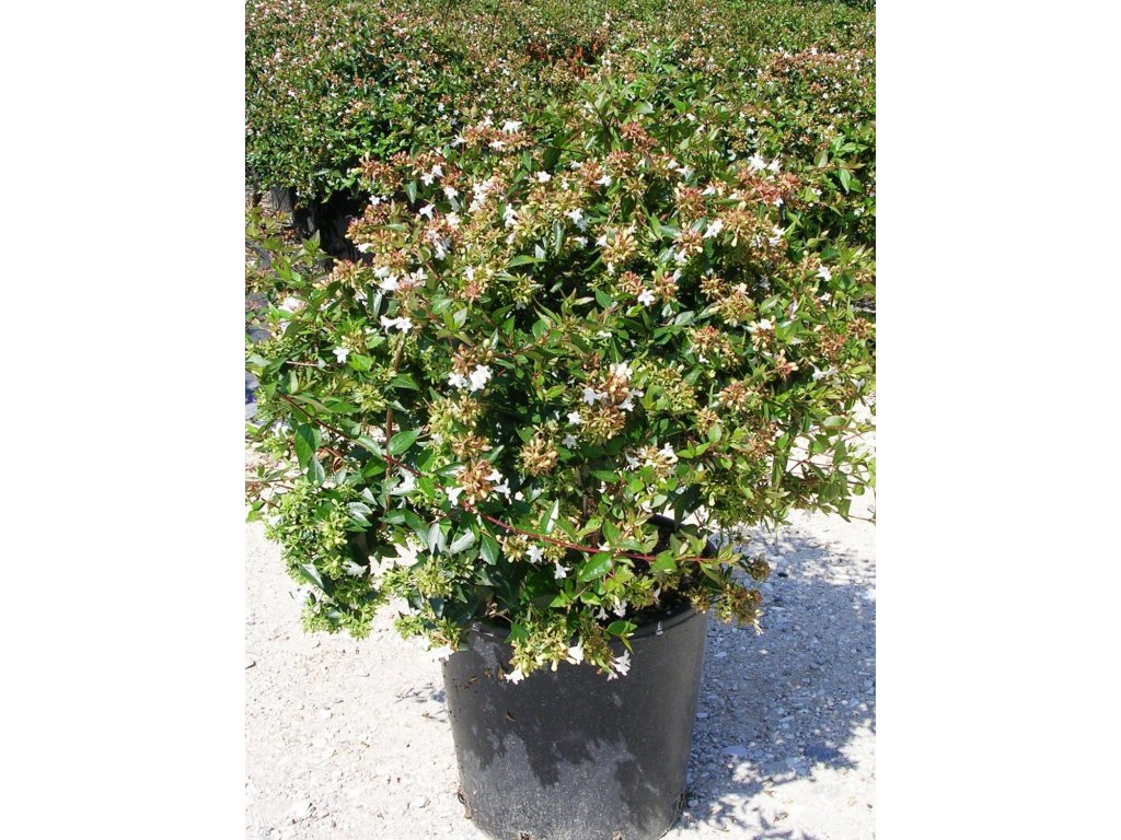 Abélie velkokvětá 'Compacta' - dekorativní stálezelený keř s kompaktním hustým růstem, vhodný pro zahrady menších i středně velkých rozměrů. Dorůstá přibližně 1–1,5 m na výšku a šířku a tvoří pravidelný, oválný habitus bez nutnosti tvarování. Listy jsou oválné, tmavě zelené a během podzimu se mění do teplých bronzových odstínů, což dodává rostlině celoroční dekorativní hodnotu. Od července do září kultivar kvete drobnými, trubkovitými květy bílo-růžové barvy, které jsou jemně aromatické a přitahují opylovače. Je nenáročná na půdní typy, odolná vůči běžným chorobám a škůdcům a mrazuvzdorná do přibližně −15 °C. Díky kompaktnímu tvaru a dlouhému květenství se dobře uplatní jako solitér, součást skupinových výsadeb, okrasných záhonů nebo do nádobových kompozic, kde poskytuje barevný kontrast a jemnou vůni. Kultivar lze kombinovat s trvalkami, okrasnými keři i stálezelenými dřevinami, čímž se zvyšuje vizuální atraktivita záhonu po většinu roku. Je ideální volbou pro zahrady, kde se oceňuje hustý, nenáročný a dlouho kvetoucí keř.