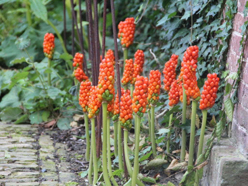 Árón italský 'Marmoratum' - hlíznatá trvalka z čeledi áronovitých, rozšířená ve Středomoří a na západě Asie, kde roste v podrostu křovin a světlých lesů na humózních půdách. Kultivar 'Marmoratum' je ceněn pro zimní efekt listů. Vytváří trsy vysoké přibližně 25–35 cm, listy jsou šípovité až srdčité, 20–30 cm dlouhé, leskle tmavozelené s krémově bílou mramorovanou žilnatinou. Listy se objevují na podzim a v mírných zimách přetrvávají, v létě rostlina často zatahuje. V dubnu a květnu se nad listy objevují zelenožluté toulce s klasy, po odkvětu se postupně vyvíjejí klasy bobulí, které se vybarvují do oranžově červené a nejčastěji zdobí od července do září. Rostlina obsahuje dráždivé látky a je jedovatá při požití, mléčná šťáva může dráždit kůži, proto se uplatní spíše v přírodních a lesních výsadbách mimo dětská hřiště. Při práci se doporučuje použít rukavice, zejména při dělení hlíz. V kompozicích dobře doplňuje čemeřice, jaterníky, kapradiny a stínomilné okrasné trávy, zajímavý je i kontrast s tmavolistými dlužichami.