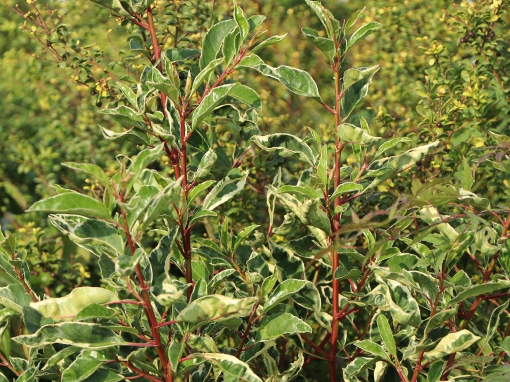 Bobkovišeň portugalská 'Variegata' - velmi dekorativní, stálezelený kultivar portugalské bobkovišně, který se vyznačuje nápadně panašovanými listy. Patří mezi elegantní a méně rozšířené odrůdy, které působí lehčím, světlejším a okrasnějším dojmem než klasické zelenolisté formy. Je vhodná jako solitéra, do skupinových výsadeb i jako originální živý plot. Roste jako hustý, vzpřímený keř dorůstající obvykle 2 až 3 metry výšky a přibližně 1,5 až 2 metry šířky. Habitus je kompaktní, dobře větvený a rostlina si udržuje stálý tvar bez nutnosti častého řezu. Listy jsou úzké, kožovité, tmavě zelené se smetanově bílým až krémovým panašováním, často s nepravidelnými skvrnami nebo lemováním. Panašování dodává rostlině svěží a elegantní vzhled během celého roku. Květy se objevují v květnu až červnu. Jsou bílé, nenápadně voňavé, uspořádané v úzkých vzpřímených hroznech, které přitahují opylovače. Po odkvětu dozrávají malé tmavě purpurové až černé bobule, které nejsou jedlé, ale na keři působí dekorativně. Mrazuvzdornost se pohybuje kolem –15 až –18 °C, proto je vhodné chráněnější stanoviště, zejména v chladnějších oblastech. Hodí se jako efektní solitéra, do kombinací s tmavozelenými keři, k terasám, vstupům, do reprezentativních výsadeb i pro středně vysoké živé ploty, kde vynikne její světlé panašování. Je také krásná v moderních i klasických zahradách, kde dokáže oživit kompozici celoročně.