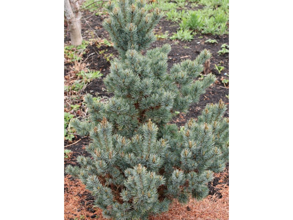 Borovice drobnokvětá 'Blue Dreamer' - patří k výjimečně pomalu rostoucím formám borovice drobnokvěté pocházející z horských oblastí Japonska. Vznikla jako čarověník na známé borovici drobnokvěté 'Early Cones', a dědí z ní schopnost brzkého nasazování dekorativních šišek. V našich podmínkách vytváří nízký, široce rozkladitý až mírně polštářovitý keř, který po deseti letech dorůstá přibližně 0,4–0,5 m výšky a 0,7–0,8 m šířky, v dospělosti kolem 0,8–1 m výšky a 1,2–1,5 m šířky. Jehlice jsou krátké, jemné, v hustých svazečcích po pěti, matně modrošedé, díky čemuž působí rostlina i v zimě lehce stříbřitým dojmem. Na jaře se objevují výrazné samčí šištice se žlutým pylem, po nich následují drobné, 4–5 cm dlouhé dřevnaté šišky, které často na větvích vytrvávají několik let a podporují celoroční dekorativnost. Díky velmi pomalému růstu a kompaktnímu habitu se uplatní ve skalce, na suchém svahu, v japonsky laděném zákoutí, ale také v prostorných nádobách na terasách a střechách. Sazenice borovice drobnokvěté 'Blue Dreamer' přinášejí do výsadby stálou strukturu a barvu, která doplňuje traviny, vřesy, nižší azalky nebo drobné okrasné javory.
