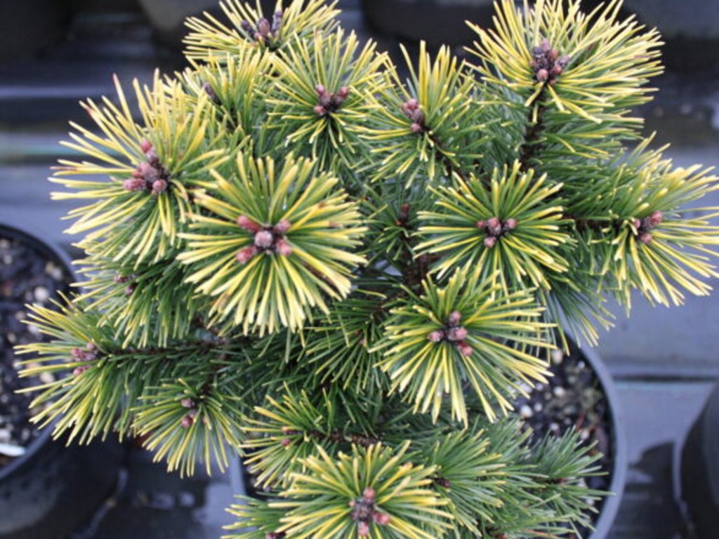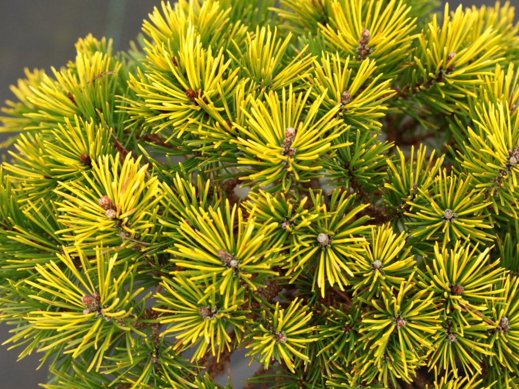 Borovice kleč 'Butternut' - pomalu rostoucí borovice, která pochází z horských oblastí střední a jižní Evropy, kde roste na kamenitých, chudších svazích a skalách vystavených větru. Kultivar 'Butternut' patří mezi miniatury vyšlechtěné z druhu pro malé zahrady a sbírkové výsadby. V našich podmínkách dorůstá přibližně 0,3–0,5 m výšky a 0,4–0,6 m šířky, roční přírůstky se pohybují kolem 2–3 cm. Tvoří husté, mírně zploštělé koule až polštáře, které zůstávají kompaktní i bez tvarovacího řezu. Větve nesou svazečky dvou jehlic dlouhých asi 4–5 cm, jehlice jsou žlutozelené, často se zeleným středem a světlejšími okraji, takže koruna působí jemně prosvětleným dojmem. Barva je nejvýraznější na plném slunci a během celého roku dodává záhonu teplý tón, v zimě dobře vyniká proti tmavším jehličnanům. Šišky se objevují jen u starších rostlin a u tohoto zakrslého kultivaru mají spíše dekorativní význam. 'Butternut' se uplatňuje jako drobná solitéra ve skalkách, vřesovištích a štěrkových záhonech, v kombinaci s vřesy, travinami a tmavě zelenými jehličnany i v nádobách na terasách, kde přináší celoroční strukturu a barvu.