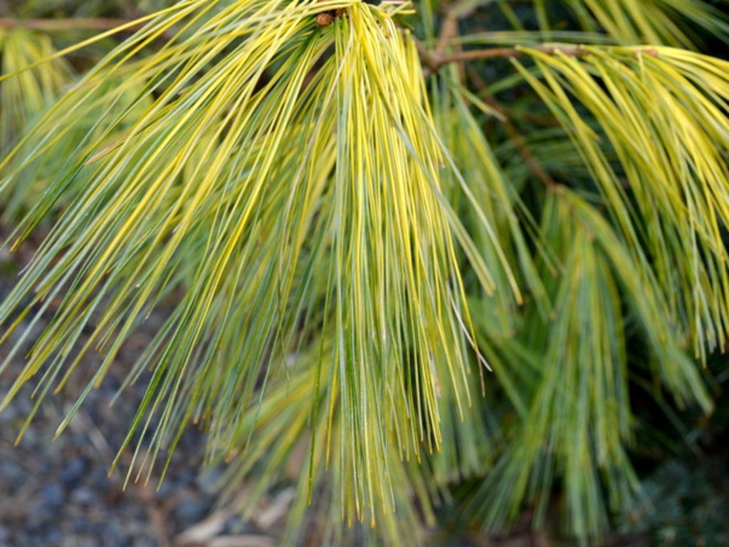 Borovice vejmutovka 'Bennett O.D.' - druhu původem ze severovýchodní části Severní Ameriky, kde tvoří rozsáhlé jehličnaté porosty. Do Evropy se dostal již v 18. století a v mírném klimatu se uplatňuje jako okrasná dřevina s jemným, měkkým jehličím. Kultivar 'Bennett O.D.' patří do skupiny forem s tzv. efektem dračího oka, kdy jsou jehlice podélně žlutozeleně pruhované. Roste jako menší, zpočátku spíše úzce kuželovitý strom s volnějším habitem. V deseti letech dorůstá přibližně 1,5–2 m výšky a 0,8–1 m šířky, v dospělosti v zahradě obvykle 3–4 m na výšku a 1,5–2 m na šířku, podle stanoviště a podmínek. Jehlice jsou měkké, po pěti ve svazečku, cca 7–10 cm dlouhé, v základní barvě modrozelené se širokými zlatožlutými pruhy. Na jaře působí nové přírůstky výrazně zlatě, během léta se zklidňují do zelenozlatého tónu a koruna tak po celý rok působí světlejším dojmem. Květní orgány jsou u borovic nenápadné, samčí šištice se objevují na jaře, samičí šištice se vyvíjejí do štíhlých, podlouhlých šišek, které se tvoří až na starších stromech. V zahradní kompozici se tento kultivar uplatňuje jako menší solitéra v trávníku, v předzahrádkách, ve vřesovištích či ve smíšených výsadbách s nižšími jehličnany a okrasnými travinami. Jemná struktura jehlic dobře kontrastuje s hrubšími listy listnatých keřů a zlaté tónování rozsvětluje tmavší zákoutí.