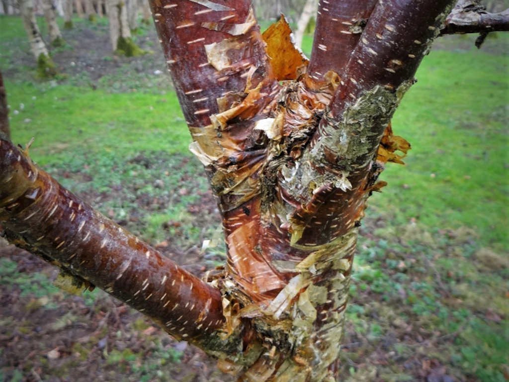 Bříza čínská 'Kenneth Ashburner' - úžasný kultivar čínské břízy z čeledi břízovitých, původem z horských oblastí severní a západní Číny. V zahradách se cení hlavně pro kmen a silnější větve v odstínech skořice, mědi a růžové, kde se borka v tenkých proužcích odlupuje a odkrývá světlejší vrstvy s jemným ojíněním. Koruna bývá vzpřímená, v mládí užší a pravidelná, postupně se rozšiřuje do kuželovitého tvaru s množstvím jemných větévek. Listy jsou vejčité, 4–7 cm dlouhé, na jaře raší bronzově zelené a na podzim se vybarvují do zlatožluta. V dubnu až květnu se objevují jehnědy, které poskytují pyl časně zjara. Název připomíná britského znalce rodu Betula Kennetha Ashburnera, s jehož jménem se pojí i moderní taxonomické pojetí skupiny. V kompozicích dobře funguje jako solitéra do trávníku, k vodní ploše nebo do štěrkových výsadeb, kde v zimě vynikne kresba borky. Kmen bývá hladký a lesklý, s výraznými lenticelami, a barevnost se během roku proměňuje od oranžovohnědé po měděně růžovou. Jehnědy jsou převislé, samčí obvykle 3–6 cm dlouhé, samičí kratší, a po odkvětu se tvoří drobné okřídlené nažky v protáhlých šišticích.