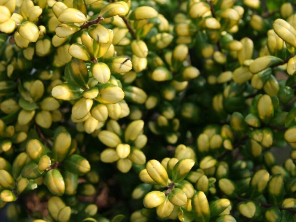 Cesmína vroubkovaná 'Convexed Gold' - stálezelený, kompaktní keřík s hustým bujným růstem, dorůstající asi 60–90 cm na výšku a 90 cm do šířky, přičemž při hodně svobodném růstu může zaujmout nižší a široce rozložený tvar. Rozlišuje se drobnými lesklými listy velkými jen kolem 1–1,5 cm, které jsou mírně vypouklé (konvexní) a od jara do předjaří září v jasně krémově žlutém odstínu, zatímco v létě se trochu zazelenají. Květy jsou nenápadné, bílé a následně se mohou po opylení objevit černé bobule, pokud je poblíž samčí rostlina stejného druhu. Vzhledem ke svému nízkému a hustému habitu je ideální náhrada za buxus v úpravách tvarovaných živých plůtků, hranic záhonů, do skalek či nádob. Řez snáší dobře a přizpůsobí se formování.