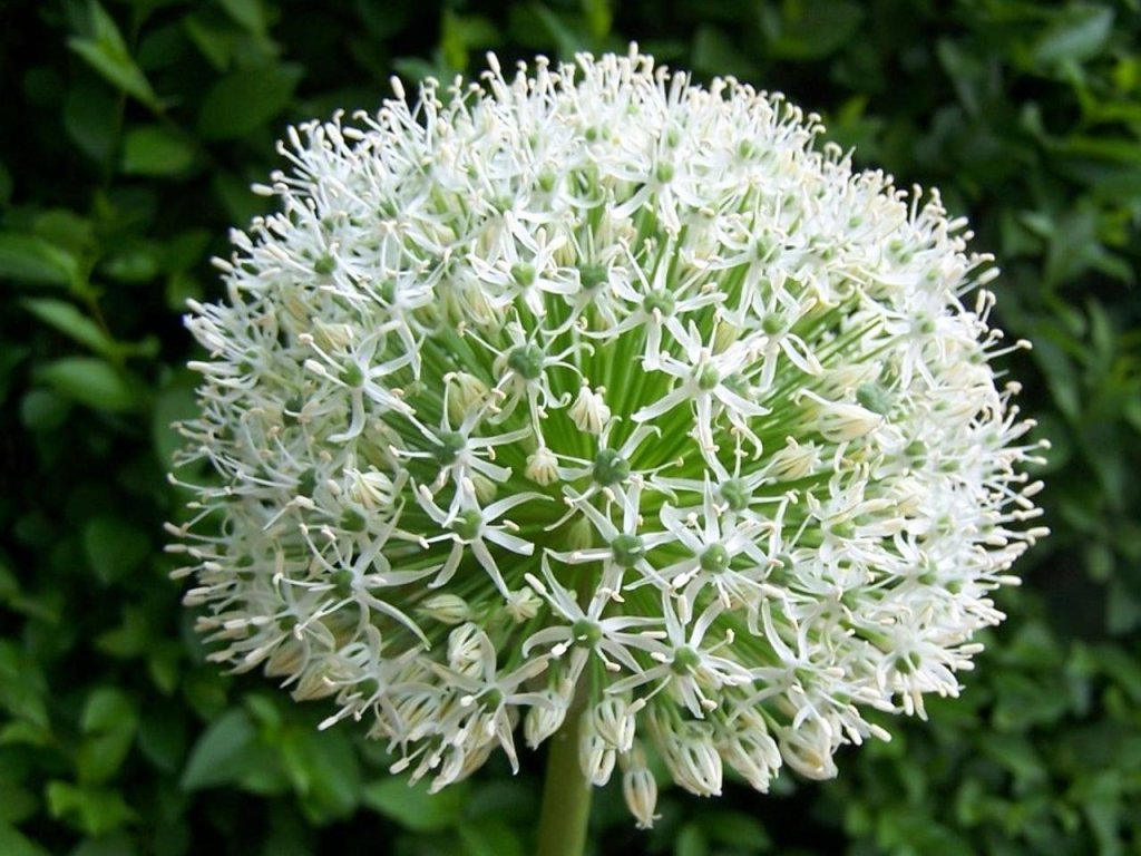 Česnek 'White Giant' - okrasný česnek s obrovskými, kulovitými květy dosahujícími do průměru až 15-20 cm. Jednotlivé hvězdicovité květy mají čistě bílou barvu, a kvetou od pozdního jara do začátku léta. Listy na rozdíl od jiných, zůstávají zelené a vzhledné i v době kvetení. Dorůstá do výšky okolo 120 cm. Vhodný k řezu do vázy. Krásně vynikne v trvalkovém záhonu.