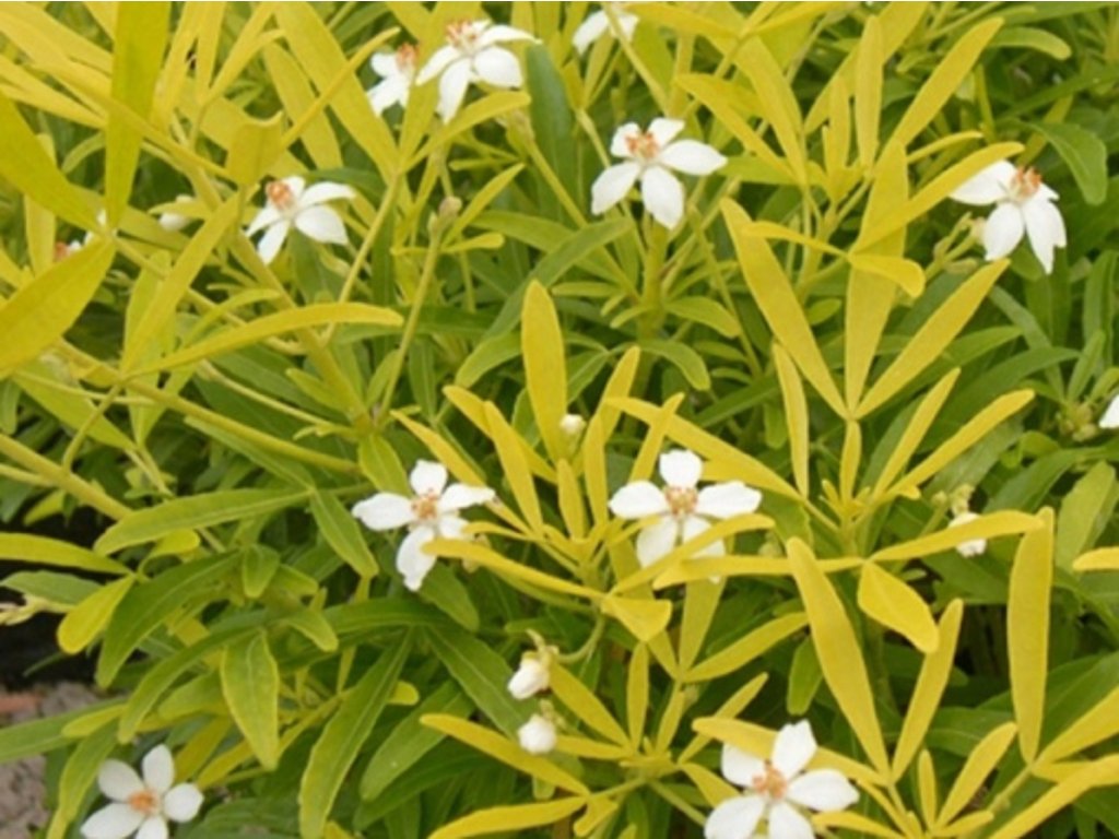 Choisya ternata 'Goldfinger'® - atraktivní kultivar, který je oblíbený díky svému pestrému, zlatavě žlutému olistění a výrazným bílým květům. Dorůstá výšky kolem 1,2 - 1,5 metru. Jedná se o stálezelený keř s kompaktním, hustým růstem. Nádherná vůně květů přitahuje včely a motýly, podporuje biodiverzitu. V zahradě se dá uplatnit na mnoha místech a to jak solitér, výsadba do nádob na terasách nebo jako živý plot či nízká stěna. Krásně se doplňuje například s fialovými či modrými rostlinami jako jsou levandule nebo šalvěj.