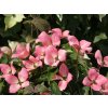 Dřín japonský 'Satomi Compact' - okrasný keř až menší strom odvozený z růžově kvetoucího kultivaru 'Satomi'. V našich podmínkách dorůstá obvykle 2,5–3 m výšky a 1,5–2 m šířky a vytváří hustý keř s vystoupavými větvemi a jemně patrovitým větvením. Listy jsou vejčitě eliptické, asi 6–10 cm dlouhé, sytě zelené a na líci mírně lesklé, často s lehce zvlněným okrajem. Na podzim se listy zbarvují do oranžových, karmínových až vínově červených tónů, takže rostlina zůstává dekorativní i po odkvětu. Koncem května a v červnu se nad olistěnými větvemi objevují drobná kulovitá květenství obklopená čtyřmi velkými, 8–10 cm širokými listeny, které mají sytě růžovou barvu a z větší vzdálenosti připomínají množství růžových hvězd rozvěšených v koruně. V teplejších a chráněných polohách nasazuje na konci léta kulovité plody veliké přibližně 2–3 cm se zrnitou slupkou a měkkou, nasládle chutnající dužninou. Plody jsou jedlé, vhodné k ochutnání přímo na zahradě nebo k domácím džemům a sirupům, obsahují cukry, vitaminy a přírodní antioxidanty typické pro druh Cornus kousa. V kompozici se 'Satomi Compact' uplatní jako solitéra v trávníku nebo ve společnosti stálezelených keřů a zvýrazní jarní kvetení i podzimní zbarvení.