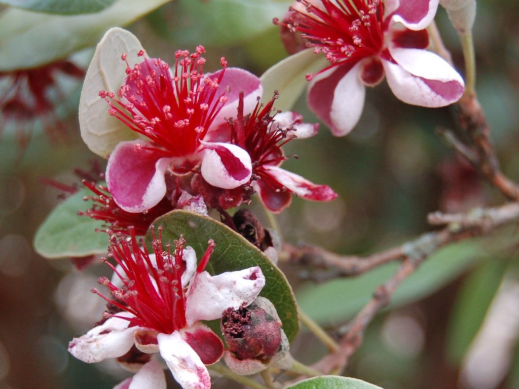 Fejchoa - pochází z horských oblastí jižní Brazílie, Uruguaye a severní Argentiny. V domovině roste na slunných svazích a v otevřených křovinách. Tento druh z čeledi myrtovitých vytváří hustý, stálezelený keř vysoký obvykle 2-3 m, v teplých podmínkách i více. Listy má kožovité, eliptické, na líci tmavě zelené, na rubu plstnaté a stříbřitě šedé, což dodává rostlině dekorativní vzhled po celý rok. V červnu až červenci rozkvétají jednotlivé květy o průměru 3-4 cm s masitými bílými až narůžovělými okvětními lístky a nápadným svazkem karmínových tyčinek. Okvětní lístky jsou jedlé a mají sladkou chuť. Plody dozrávají od října do listopadu, jsou vejčité, 4-8 cm dlouhé, se zelenou slupkou a krémovou dužninou. Chuť je aromatická, připomíná kombinaci ananasu, jahod a máty. Obsahují vitamin C, vlákninu a polyfenoly. Pro vyšší úrodu je vhodné pěstovat dvě geneticky odlišné rostliny, protože cizosprašnost zvyšuje násadu plodů.