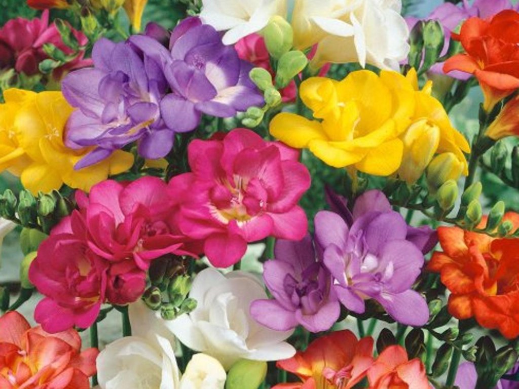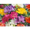 Frézie double - frézie rodu Freesia pocházejí z jižní Afriky, kde rostou v oblastech s mírným zimním obdobím a suchým létem. V přirozeném prostředí jsou přizpůsobeny střídání vlhkého růstového období a následného klidu. Freesia double – mix zahrnuje směs šlechtěných kultivarů s plnými, bohatě vrstvenými květy, které vznikly cíleným výběrem pro vyšší dekorativní hodnotu. Květy jsou nálevkovité, plnokvěté, uspořádané jednostranně na obloukovitě prohnutých stoncích a vyznačují se výraznou, sladce kořenitou vůní. Barevná škála obvykle zahrnuje odstíny bílé, krémové, žluté, růžové, červené i fialové. Listy mají úzké, mečovité, svěže zelené a vyrůstají z drobných hlíznatých hlíz typu kormus. Rostliny dorůstají výšky přibližně 35-50 cm a působí jemně, ale zároveň elegantně vzpřímeně. Doba kvetení připadá nejčastěji na období od března do května v závislosti na termínu výsadby a podmínkách pěstování. Díky plným květům a intenzivní vůni patří plnokvěté frézie mezi nejvyhledávanější květiny k řezu, kde vyniknou samostatně i v kombinaci s dalšími jarními cibulovinami nebo jemnými trvalkami.
