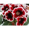 Gloxínie 'Kaiser Friedrich' - botanicky řazená do rodu Sinningia, pochází z tropických oblastí Jižní Ameriky, především z Brazílie, kde roste v polostinném podrostu světlých lesů s vysokou vzdušnou vlhkostí a humózními půdami. Kultivar 'Kaiser Friedrich' patří mezi klasické, dlouhodobě pěstované šlechtěné formy určené výhradně pro interiérové použití. Vytváří zploštělou zásobní hlízu, z níž vyrůstá přízemní růžice širokých, měkkých a jemně chlupatých listů tmavě zelené barvy se sametovým povrchem. Listová růžice dosahuje výšky 20-30 cm a šířky přibližně 25-35 cm, působí kompaktně a vyváženě. Květy jsou nápadné, velké, nálevkovité, s výrazně sametovou texturou okvětních plátků. Základní barva je sytě karmínově červená, zakončená kontrastním světlejším lemem, který zvýrazňuje pravidelný tvar květu a dodává mu plastický vzhled. Jednotlivé květy se objevují postupně na krátkých, pevných stopkách a vytvářejí souvislou vlnu kvetení, která probíhá zpravidla od června do srpna. Kultivar se neuplatňuje venku, ale výhradně jako pokojová rostlina, kde vynikne jako solitéra na světlém parapetu nebo jako barevný akcent v kombinaci s rostlinami s klidnějším olistěním. Květy nejsou vonné, jejich hlavní hodnotou je intenzita barvy, textura a pravidelnost tvaru.