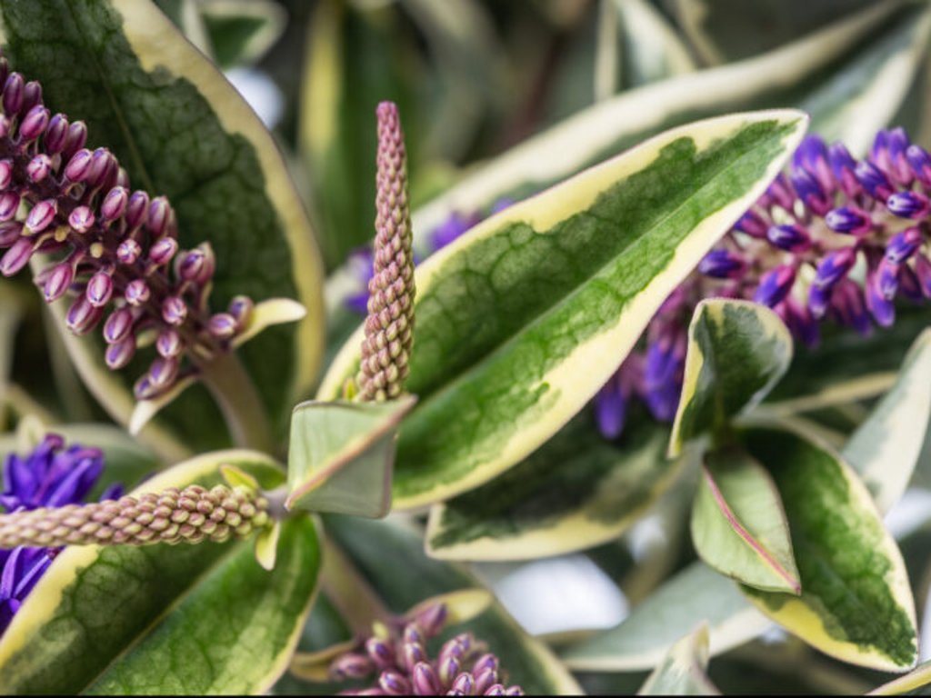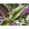 Hebe 'Varia Wild Blue' - stálezelený, kompaktně rostoucí keřík, který vyniká dekorativními listy i nápadným kvetením. Dorůstá výšky kolem 30–40 cm a tvoří husté, kulovité trsy. Listy jsou drobné, lesklé, středně zelené a udržují si svou okrasnost po celý rok. Od července do září kvete bohatými klasy drobných fialovomodrých květů, které lákají včely a další opylovače. Je ideální do nádob, menších záhonů či na okraje cest a chodníků.