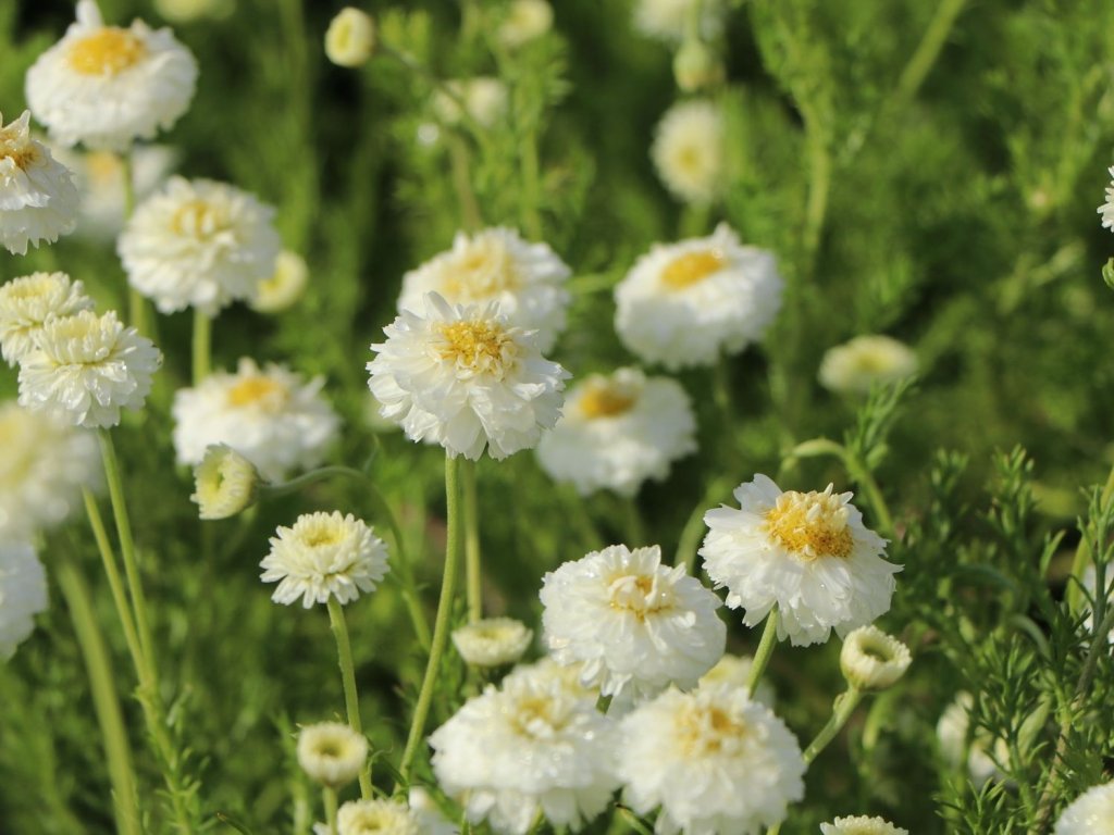 Heřmánek římský 'Plenum' - aromatická trvalka z čeledi hvězdnicovitých, původem ze západní Evropy, kde osidluje slunné loučky, pastviny a okraje cest na lehkých, často vápenitých půdách. Kultivar 'Plenum' (uváděný také jako 'Flore Pleno') je plnokvětá forma s nízkým, hustým trsem, který se krátkými výběžky postupně propojuje do půdopokryvného koberce. Přízemní listy jsou jemně peřenosečně dělené, tmavě zelené, při doteku výrazně aromatické a působí dekorativně i mimo dobu květu. Od června do srpna se nad listy zvedají krátké lodyhy a nesou drobné, plné bílé úbory přibližně 2–3 cm, v nichž je žlutý terč částečně překryt jazykovitými květy, takže květ působí jako drobná rozetka. Kvetení přitahuje včely i drobné motýly a v teplých létech se může protáhnout do konce srpna. Rostlina vytváří světlý, klidný akcent do štěrkových záhonů, bylinkových lemů i k nášlapům, kde jemné olistění změkčuje hrany kamenů. V kompozici dobře navazuje na levandule, mateřídoušky, kostřavy, řebříčky nebo nízké šalvěje. Heřmánek se tradičně uplatňuje v bylinářství a kosmetice pro obsah silic a hořčin, u plnokvětých forem se však pěstuje především pro okrasný efekt, rovnoměrný habitus a čisté letní kvetení.