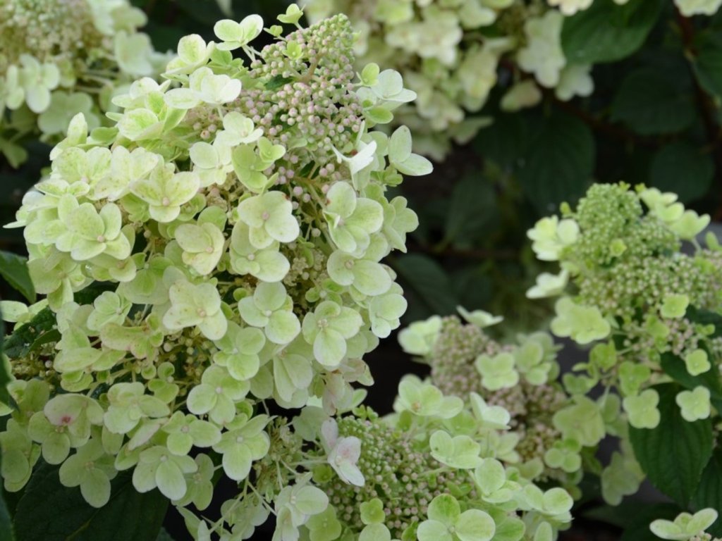 Hortenzie latnatá 'Bee Happy®' - kompaktní kultivar z moderní série, vybraný pro bohaté a přehledné kvetení i spolehlivý růst v menších zahradách. Keř má hustý, vzpřímený až mírně klenutý habitus a v dospělosti dorůstá přibližně 0,4–0,5 m výšky a přibližně stejné šířky. Listy jsou vejčité, sytě zelené a během sezóny vytvářejí pohlednou kulisu pro květenství. Ta tvoří kuželovité laty o délce 15–20 cm, nejprve čistě bílé, později v průběhu léta přecházející do jemně růžových odstínů. Barva se mění podle teplot a intenzity slunce, takže záhon působí živě i bez použití mnoha různobarevných kultivarů. Kvetení nastupuje obvykle v červenci a pokračuje až do září. Laty nesou drobné fertilní květy i větší sterilní květy, které zajišťují plnost tvaru. Květy jsou atraktivní pro včely a další opylující hmyz, proto se keř hodí i do přírodně laděných kompozic. Díky menší výšce se kultivar dobře kombinuje s travinami, nižšími růžemi, kakosty nebo šantami a v blízkosti teras a posezení dodává záhonu jemně romantický tón.