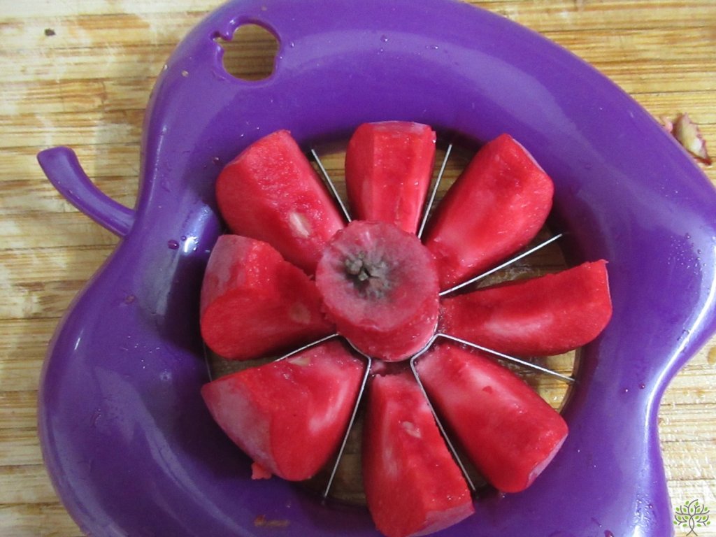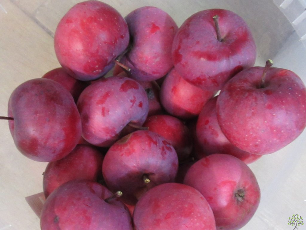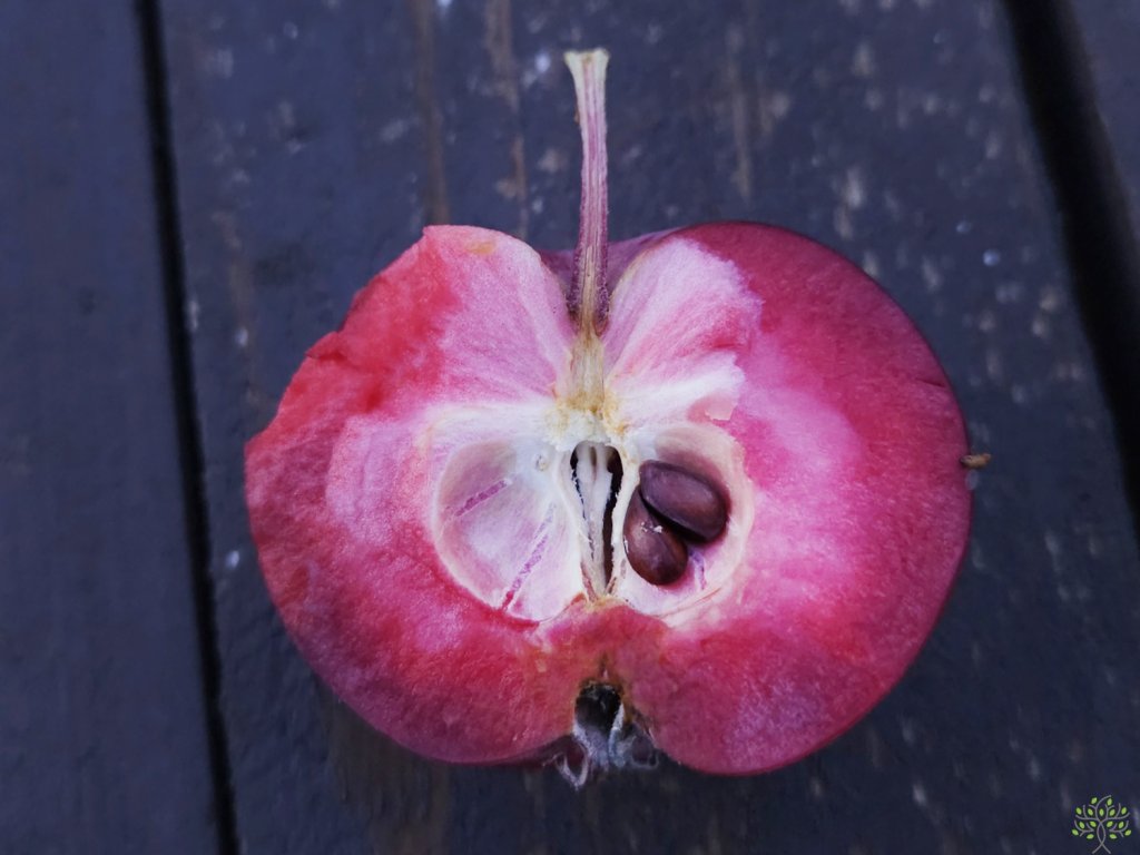 Jabloň 'Red Love' - švýcarská lahůdka opět v naší nabídce! Stromy rostou středně silně, dobře obrůstají plodným obrostem a kvetou i na jednoletém dřevě. Poupata jsou tmavě purpurově červená a korunní plátky po rozkvětu hrají všemi odstíny růžové. Okrasný i užitkový strom v jednom! Jablka narůstají nadprůměrně velká (200g +) a jsou ploše kulovitého tvaru. Slupka má tmavě vínově červenou barvu s bílými lenticely, rovněž stopky plodů a listové řapíky jsou vínové. Červená dužnina s růžovým a bílým mramorováním chutná výborně sladce nakysle s ušlechtilou stopou růžového vína. Sklizeň krásných jablek nastává na konci září, do konzumní zralosti dospějí za dva týdny, se skladovatelností do prosince až ledna. ‘Red Love‘ netrpí strupovitostí ani padlím.