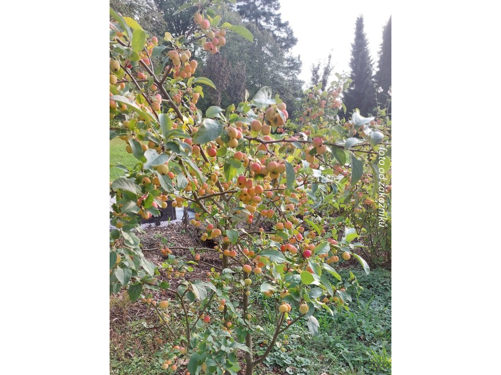 Jabloň lesní - středně vzrůstný strom, který v dospělosti dosahuje výšky 7 - 9 m, dle podmínek pěstování. Jedná se o nepravidelně rostoucí strom s poměrně volnou, zaoblenou korunou. Kůra stromu je šedá, listy mají vejčitý, oválný tvar a mají lesklou zelenou barvu. Na mladých větvičkách se mohou objevit trny. Začíná kvést již počátkem května a květy se vybarvují do bílo-růžova. Květy následně nahradí zeleno-žluté plody s červeným ruměncem, které v případě tohoto stromu plní spíše okrasný charakter.