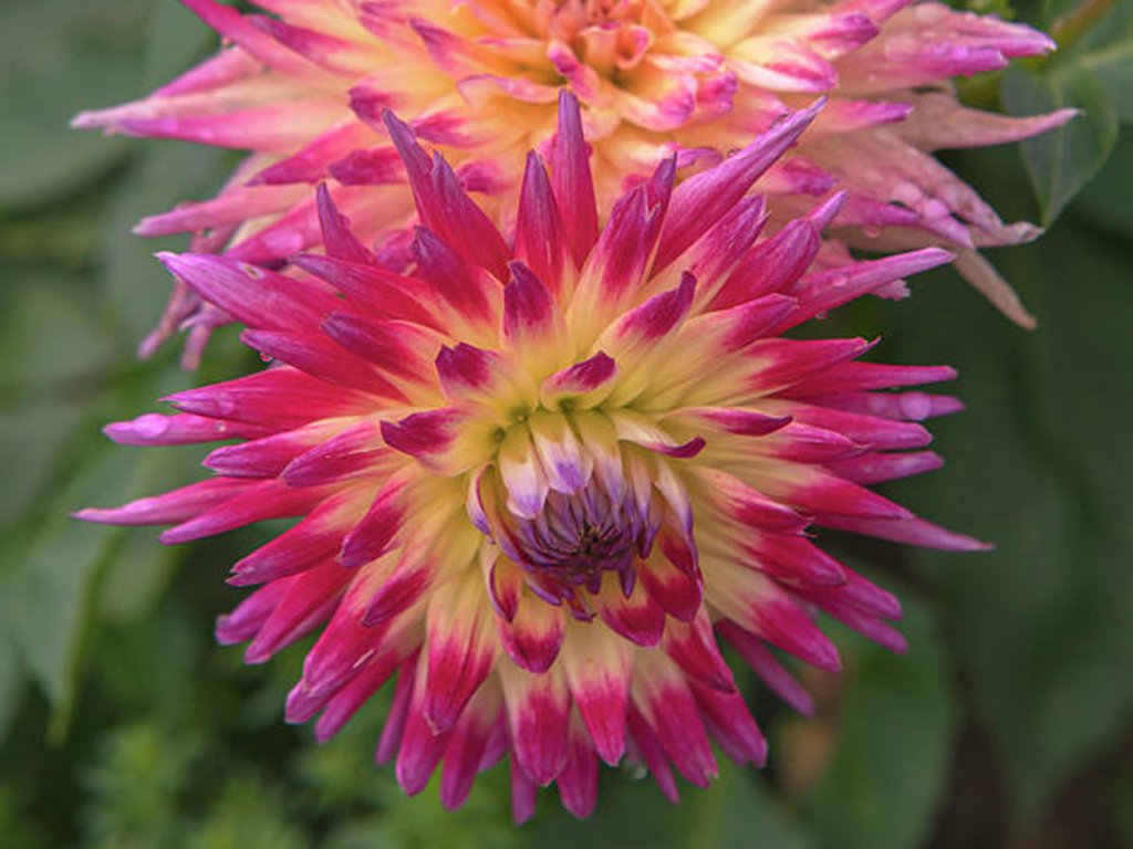 Jiřina 'Electric Flash' - patří do čeledi hvězdnicovitých a botanické druhy pocházejí z horských oblastí Mexika a Střední Ameriky, kde střídání sucha a dešťů podporuje tvorbu zásobních hlíz. Kultivar 'Electric Flash' se řadí mezi polokaktusové až kaktusové jiřiny. Jazykovité květy jsou špičaté a částečně stočené dozadu, takže úbor nepůsobí ploše, ale vytváří jemně jehlicovitou texturu. Květy dosahují přibližně 16 cm a během zrání zvýrazňují dvoubarevnost od žluté se zlatým středem k růžovočerveným až purpurově tónovaným špičkám. Listy jsou zpeřené, středně zelené, stonky pevné, často s lehkým tmavším nádechem. V plné sezoně vytváří trs zhruba 90–100 cm vysoký a kolem 40 cm široký. Květ obvykle nevoní a včely a motýli jej navštěvují méně než jednoduché jiřiny, zato barva dobře drží i v podvečerním světle. V kompozici se uplatní jako energický akcent mezi okrasnými travami, sporýši, šalvějemi nebo třapatkami. Do vazby přináší pravidelnou strukturu a při řezu v polovině rozkvětu mívá ve váze životnost přibližně 5–7 dní, zejména při čisté vodě a chladnějším umístění.