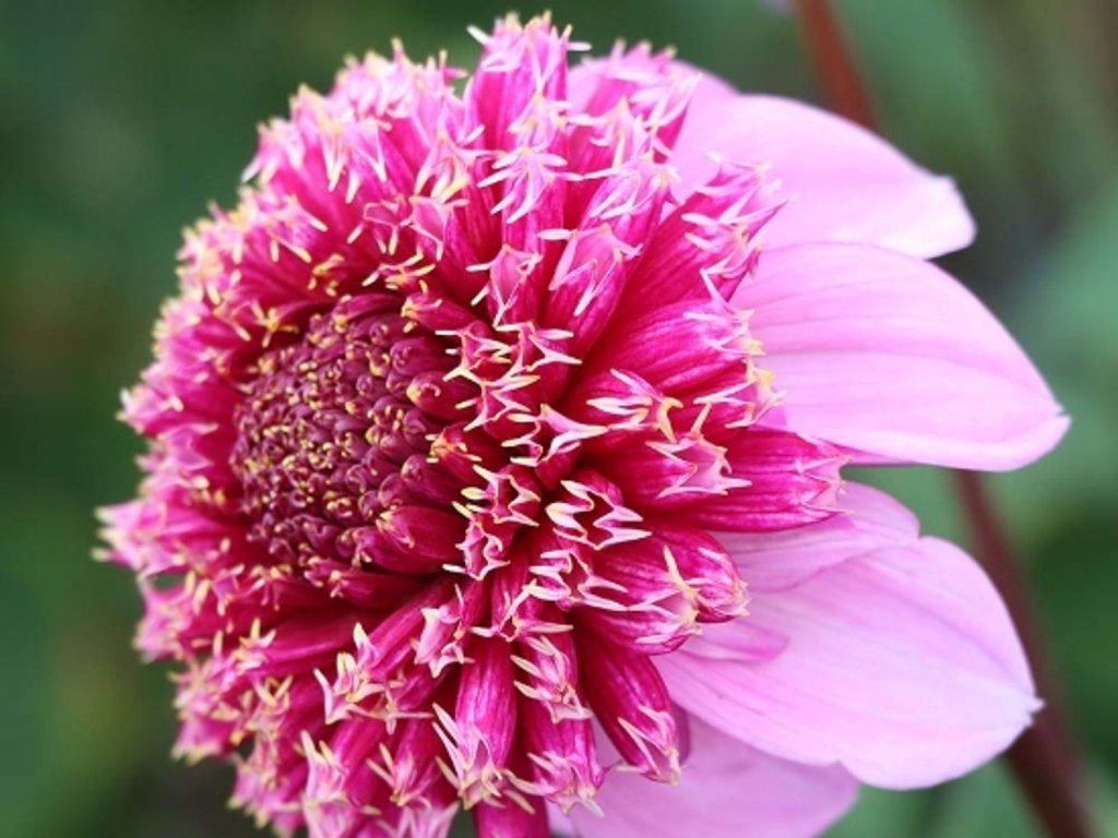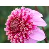 Jiřina 'Fenna Baaij' - z čeledi hvězdnicovitých, vychází z druhů původem z Mexika a Střední Ameriky. Kultivar 'Fenna Baaij' je v evropských katalozích veden jako sasankovitá jiřina, vyšlechtěná pro lehký květ a použití do záhonu i na řez. Květní úbor tvoří jeden věnec širších jazykovitých květů v jemné růžové, který obklopuje vystouplý „polštář“ krátkých trubkovitých kvítků ve žluté až zlatavé. Průměr květů bývá okolo 8–10 cm, barva se může mírně měnit podle teploty a vyzrálosti květu. Květy se objevují od července do října, při dlouhém podzimu až do prvních mrazů, a díky otevřenější stavbě působí vzdušněji než plně dvojité typy Ball či Pompon. Otevřenější střed bývá atraktivnější i pro opylovače než plně dvojité formy. Rostliny vytvářejí kompaktní trs přibližně 80–100 cm vysoký a 35–45 cm široký, se zpeřenými, středně zelenými listy a pevnými, někdy tmavěji tónovanými stonky. V řezu poskytuje kultivar drobnější, dobře čitelné květy, které v kyticích přidávají jemnou texturu bez velké hmotnosti. V záhoně se osvědčuje mezi okrasnými travami, sporýši, třapatkami a šalvějemi, kde růžová měkce navazuje na meruňkové i krémové tóny a žlutý střed přidá teplý akcent i v podvečerním světle.