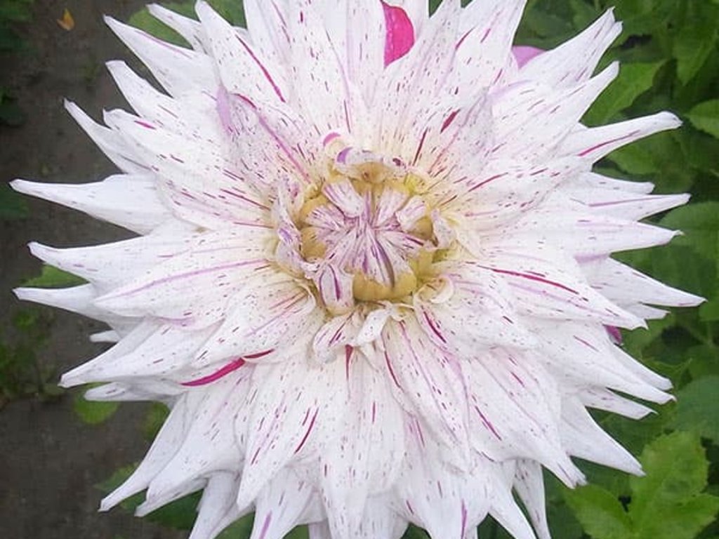 Jiřina 'Mick's Peppermint' - atraktivní kultivar jiřiny s plným kaktusovým květem. Hlíznatá trvalka z čeledi hvězdnicovitých, v českých zahradách pěstovaná jako letní okrasná rostlina. Rod Dahlia pochází z Mexika a Střední Ameriky, zatímco zahradní hybridy vznikly dlouhodobým šlechtěním pro vyrovnané kvetení a pevnější stonky. Kultivar byl v zahradních katalozích uváděn od roku 1992 a v rámci třídění RHS patří mezi polokaktusové jiřiny. Tvoří vzpřímené trsy s dutými, pevnými stonky a tmavě zelenými, zpeřenými listy. Od července do října, často až do prvních podzimních mrazíků, se otevírají plně dvojité květy o průměru přibližně 20–22 cm. Bílý základ je nepravidelně postříkaný růžovou až purpurovou, někdy v jemném žíhání, takže žádné dva květy nebývají stejné. Okvětní lístky jsou protáhlé a částečně stočené, květ má lehce „jehličkový“ reliéf. Vůně bývá nevýrazná. Květy jsou vhodné k řezu a v čisté vodě obvykle vydrží 5–7 dní, proto se uplatní v kyticích i jako solitérní akcent. V záhonech dobře ladí s okrasnými travami, sporýši, šalvějemi a podzimními astrami, kde mramorování květů působí jako jemně rozptýlené světlo.