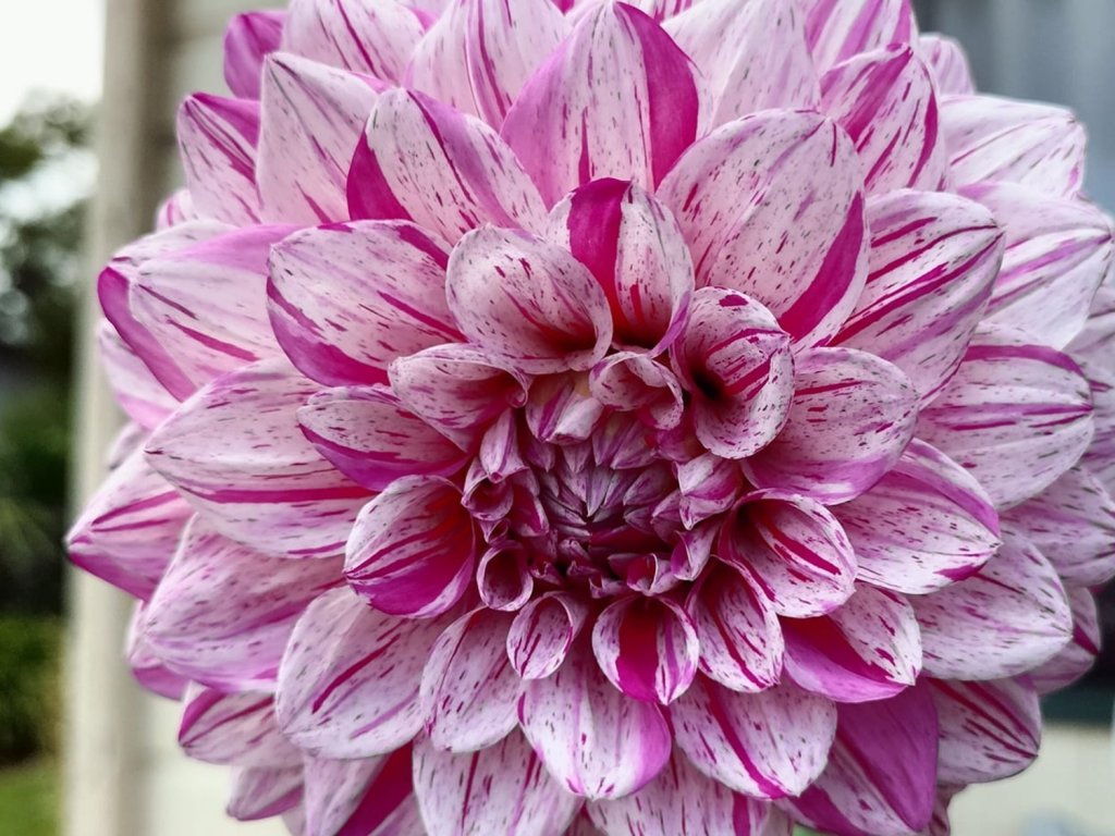 Jiřina 'Peppermint Splash' - nádherný kultivar jiřiny s plným květem kaktusového tvaru. Trvalka z čeledi hvězdnicovitých, navazující na druhy z Mexika a Střední Ameriky, kde rostou na slunných svazích a v otevřených porostech s výrazným střídáním sucha a letních dešťů. Zahradní hybridy vznikly šlechtěním pro delší kvetení, větší květy a pevnější stavbu rostlin. Kultivar 'Peppermint Splash' se řadí mezi dekorativní jiřiny s hustě plnými úbory a pravidelně vrstvenými jazykovitými květy. Od července do října se otevírají květy přibližně 15–20 cm široké, na bílém podkladu nepravidelně stříkané a žíhané růžovou až purpurovou, takže žádné dva úbory nebývají stejné. Okvětní lístky jsou široké a mírně špičaté, květ zůstává kompaktní i po dešti a při řezu drží tvar. Rostlina tvoří vzpřímený trs obvykle 100–150 cm vysoký a 50–70 cm široký, s dutými, pevnými stonky a tmavě zelenými, zpeřenými listy s jemně pilovitým okrajem. Vůně je nevýrazná a plně dvojité květy mají pro opylovače jen omezený přínos. Kultivar se uplatní ve smíšených letních záhonech i ve větších nádobách u teras, dobře ladí s okrasnými travami, sporýši a šalvějemi. Květy jsou vhodné k řezu, ve váze při čisté vodě obvykle vydrží 5–7 dní.