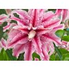 Lilie 'Magic Star' - výrazný orientální kultivar lilie z čeledi Liliaceae, vyšlechtěný s důrazem na plné květy, bohatou kresbu a intenzivní vůni. Rod Lilium má přirozené rozšíření v mírném pásmu severní polokoule, zejména ve východní Asii, kde roste na otevřených, dobře odvodněných stanovištích s hlubšími, humózními půdami. Kultivar ‘Magic Star’ vytváří vzpřímené, pevné stonky dosahující výšky přibližně 90-110 cm, rovnoměrně olistěné úzkými až kopinatými listy sytě zelené barvy, které tvoří klidné pozadí pro výrazná květenství. Květy jsou velké, plné až dvojité, orientované převážně vzhůru, s pevnou stavbou okvětních lístků. Základní barva květů je krémově bílá, výrazně doplněná karmínově červenými pihami rozptýlenými po ploše okvětních lístků a tmavě růžovým pruhem probíhajícím středem každého lístku. Tato kontrastní kresba dodává květům hloubku a ornamentální charakter, který se dobře uplatňuje jak v zahradních výsadbách, tak ve floristice. Květy jsou výrazně vonné, s typickou sladkou vůní orientálních lilií, a rozvíjejí se postupně v průběhu léta, obvykle od července do srpna. V zahradních kompozicích se kultivar uplatňuje jako solitér v trvalkových záhonech, ve skupinových výsadbách i v kombinaci s okrasnými travami či trvalkami s jemnějším květem. Díky pevné stavbě stonků a trvanlivosti květů je vhodný také k řezu.