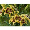 Lilie 'Pieton' - zahradní hybridní lilie vyšlechtěná s důrazem na výraznou barevnou kresbu květů a pevný, vzpřímený růst. Kultivar vytváří přímé stvoly s úzkými, leskle zelenými listy uspořádanými podél celé lodyhy a dorůstá výšky přibližně 120-140 cm. V období června až července se na vrcholcích stvolů postupně otevírají velké květy, jejichž sytě žluté okvětní plátky kontrastují s tmavě kaštanovým středem. Barevná kombinace je dobře čitelná i z větší vzdálenosti a působí vyváženě v kombinaci s neutrálně zelenými nebo jemně kvetoucími trvalkami. Květy jsou orientovány převážně vzhůru až lehce stranově a díky pevným stonkům se kultivar uplatňuje nejen v zahradních záhonech, ale také jako kvalitní materiál pro řez. V kompozicích se dobře kombinuje s okrasnými travinami, levandulí, šalvějemi nebo nižšími keři s klidným habitusem, kde vynikne jeho barva i vertikální linie.