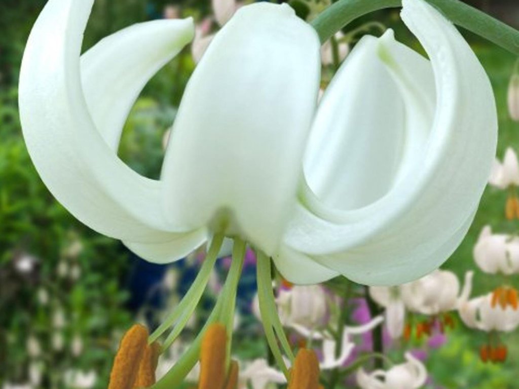 Lilie 'Snowy Morning' - Hybrid zlatohlavé lilie. Okvětní plátky jsou sněhově bílé, stočené. Uvnitř okvětních plátků jsou výrazné zelené hvězdice, korunu hvězdici nasazují oranžové pestíky. Dorůstá do výšky okolo 90-100cm a květy se objevují začátkem léta.
