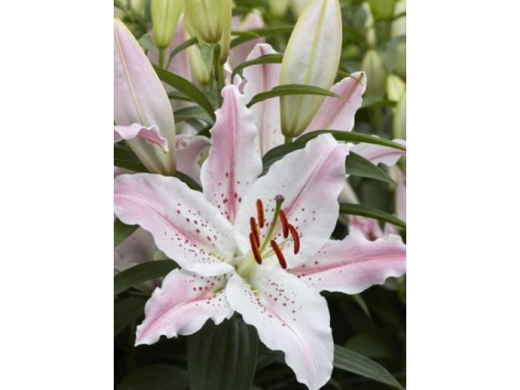 Lilie 'Virtuoso' - exotická lilie, která svými květy rozzáří každou zahrádku. Má bílý základ s růžovým přelivem s výraznými červenými tečkami a červenými prašníky. Kvete od června do července a dorůstá až 110 cm. Můžete ji pěstovat jak na zahrádce tak v květináči. Intenzivně sladce voní. Láká motýly a jiný medonosný hmyz. Potěší vás také nařezaná ve váze.