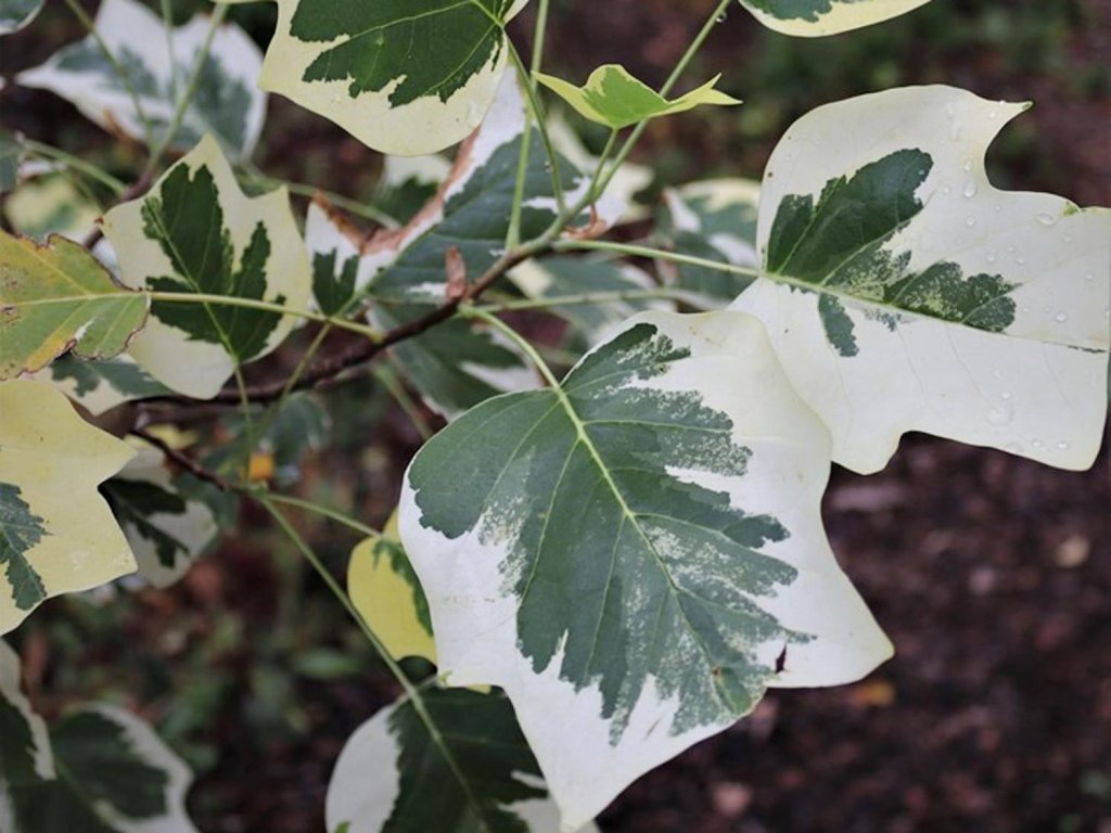 Liliovník tulipánokvětý 'Snowbird' - okrasný kultivar severoamerického liliovníku pocházejícího z vlhkých lesů východních oblastí USA. Základní druh je v Evropě pěstován již po staletí, zatímco 'Snowbird' patří k modernějším výběrům oceňovaným pro panašované olistění. Listy jsou čtyřlaločné, přibližně 8-12 cm široké, se světle až středně zelenou plochou a výraznými krémovými okraji, které vytvářejí svěží kontrast. Panašování se během sezóny mírně proměňuje a s postupujícím létem získává teplejší krémový odstín. Koruna bývá široce pyramidální, dobře větvená, v dospělosti o výšce zhruba 10-15 m a šířce přibližně 5-7 m v závislosti na stanovišti. V červnu se objevují tulipánkovité květy, přibližně 4-6 cm velké, žlutozelené s oranžovým pruhem u báze okvětních lístků. Květy jsou mírně vonné a poskytují nektar včelám. Po odkvětu se vytváří kuželovitá plodenství s křídlatými semeny. Na podzim listy žloutnou do teplých odstínů, zatímco panašování zůstává patrné až do opadu. Uplatňuje se jako výrazný solitér v trávníku, u vstupních prostor nebo v parcích, tam jeho světlé olistění zvýrazňuje kompozici po celou sezónu. Hodí se k vodním prvkům i do větších zahrad, kde vyžaduje prostor pro kořenový systém i korunu.