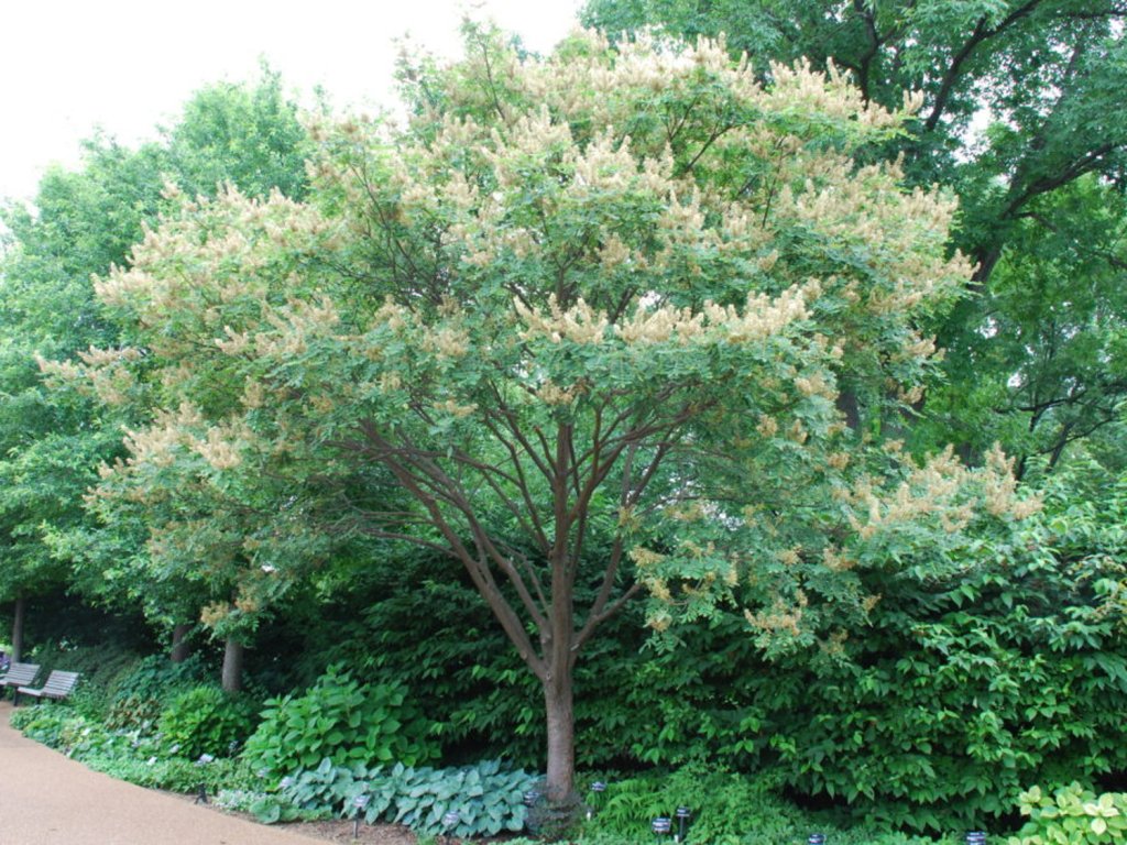 Mákie amurská - listnatý strom z čeledi bobovitých, pocházející z povodí Amuru a z Mandžuska, kde roste na světlých okrajích lesů a na kamenitých svazích. V Evropě se pěstuje jako sbírková dřevina a solitéra díky proměnlivé textuře listů a pozdnímu kvetení. Koruna bývá v mládí kulovitá, později široce deštníkovitá. V našich podmínkách dorůstá obvykle 8–12 m a 6–10 m do šířky. Lichozpeřené listy nesou nejčastěji 7–11 vejčitých lístků dlouhých 5–8 cm. Při rašení jsou nápadně stříbřitě plstnaté, v létě tmavě zelené a ze spodní strany jemně ochlupené. V červenci až srpnu se objevují vzpřímené hrozny 10–15 cm s drobnými, motýlovitými, bílými až smetanovými květy o velikosti kolem 1 cm, často s jemnou vůní. Po odkvětu dozrávají ploché hnědé lusky dlouhé zhruba 3–6 cm. Borka starších stromů se místy odlupuje do měděně bronzových map. Jako bobovitá dřevina vytváří symbiózu s hlízkovými bakteriemi a umí vázat dusík, takže se osvědčuje i na méně úrodných stanovištích. Dobře zapadá do výsadeb s dřínem, tavolníkem nebo okrasnými travinami, v městském prostředí se uplatní i jako alejový strom. Pro vyhledávání na e-shopu se často používá dotaz sazenice Maackia amurensis nebo pěstování mákie amurské.