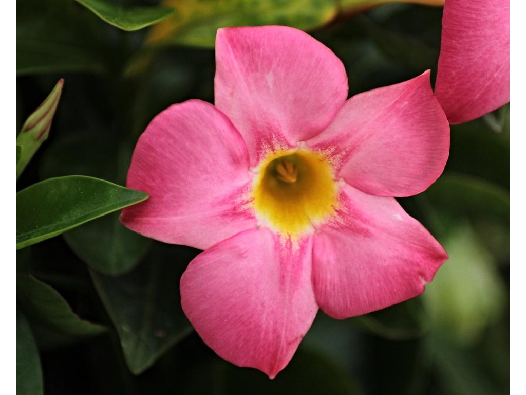 Diplandénie 'Rio Hot Pink' - nádherná, popínavá liána s lesklými, zelenými listy a velkými, sladce růžovými květy, dorůstající do výšky kolem 2-3 m. Květenství se objevuje od května do října. Pěstujeme ji v truhlíkách, závěsných koších, přenosných nádobách na terase, balkonu nebo i jako pokojovou rostlinu. Mandevilla se bohatě rozrůstá a buď šplhá po opoře, nebo ji můžeme nechat vytvářet půvabné převisy, případně ji můžeme zaštipovat do kompaktních keříků s květy po obvodu.