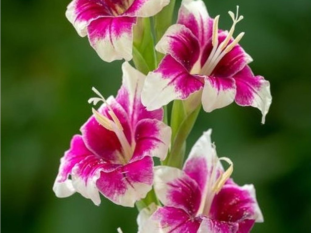 Mečík 'Adrienne' - veselý kultivar s velkými, zářivě růžovými květy, jejichž kontrast se sytě zelenými listy umocňují okvětní plátky v čistě bílé barvě. Dorůstá do výšky 120 cm. Nakvétá od července.