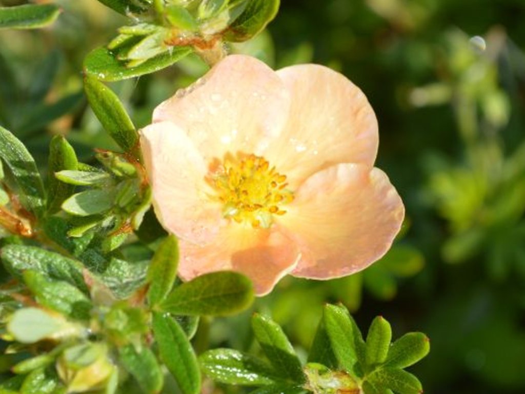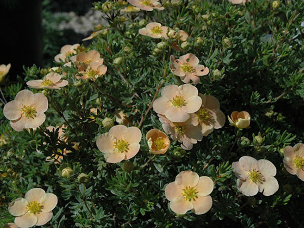 Mochna křovitá 'Daydawn' - patří do skupiny nízkých opadavých keřů, které vycházejí z druhu rozšířeného v chladnějších oblastech Evropy, Asie i Severní Ameriky na světlých stráních a kamenitých loukách. V našich podmínkách vytváří hustý, mírně rozkladitý keř vysoký přibližně 0,6–0,8 m a široký okolo 1–1,2 m. Výhony jsou tenké, bohatě větvené a nesou dlanitě složené listy složené obvykle z pěti až sedmi úzkých lístků. Olistění působí šedozeleně až modrozeleně a díky jemné textuře připomíná drobnou kapradinu, což dodává keři lehký, přesto plný vzhled. Hlavní ozdobou je dlouhé kvetení, které při příznivém počasí probíhá od května do září. Na koncích mladých větviček se otevírají miskovité květy o průměru kolem 3–4 cm, jejichž střed bývá krémově až světle žlutý, zatímco okraje korunních plátků nesou meruňkový či lososově růžový nádech. Jednotlivé květy vydrží krátce, neustále se však objevují nové, na keři tak bývají současně poupata, čerstvé květy i odkvetlé zbytky. Květy poskytují nektar a pyl včelám a dalším opylovačům, plody v podobě drobných nažek nemají význam pro využití v kuchyni a rostlina se pěstuje výhradně jako okrasná. 'Daydawn' se uplatní jako jemně barevný prvek v nízkých živých plotech, ve skupinách na svazích, v popředí keřových výsadeb i v přírodně laděných kompozicích, kde doprovází okrasné trávy, levandule či jiné trvalky.