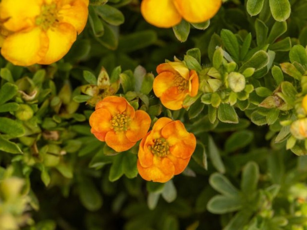 Mochna křovitá ‘Marmalade’® - krásný a jemný kultivar vyšlechtěný Jeffries Nursery v Kanadě, který dorůstá do výšky i šířky 60–90 cm. Keř je kompaktní, kulovitý a velmi hustě rostoucí, což z něj činí elegantní solitéru i vhodnou rostlinu pro skupinové výsadby. Květy jsou dvojité, karmínově oranžové a nakvétají od začátku léta až téměř do podzimu, přičemž lákají motýly a včely, čímž podporují biodiverzitu zahrady. Kultivar se nádherně uplatní na hranicích záhonů, ve skalkách, nízkých živých plotech či v nádobách na terasách a balkonech. Vyniká rovněž v kombinaci s modrými trvalkami, například s nepetou, šalvějí nebo perovskií, případně s jemnou texturou okrasných trav, čímž přináší kontrast a harmonii do každé zahradní kompozice.