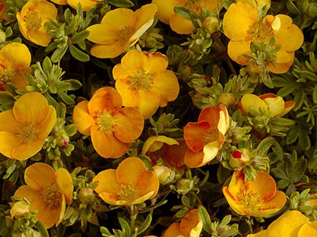 Mochna křovitá 'Tangerine' - nízký opadavý keř z čeledi růžovitých. Kultivar 'Tangerine' vytváří hustý, mírně rozkladitý keř dorůstající přibližně 0,6–0,8 m výšky a 0,8–1 m šířky. Výhony jsou tenké, silně větvené a nesou drobné lichozpeřené listy složené z úzkých lístků šedozelené až středně zelené barvy. Olistění působí jemně, ale při skupinové výsadbě vytváří souvislý porost vhodný k pokrytí půdy. Od května do října se na koncích mladých výhonů objevují jednoduché pětičetné květy o průměru kolem 2–3 cm v odstínech žluté a oranžové, často s výraznějším žlutooranžovým středem. V chladnějších obdobích je tón květů sytější, v letních vedrech se barvy mohou mírně zesvětlit. Kvetení probíhá ve vlnách a keř tak působí živě po velkou část vegetace. Květy poskytují nektar a pyl včelám a dalším opylovačům, proto je mochna vhodná i do přírodě blízkých a užitkově laděných výsadeb. Plody v podobě drobných nažek nemají praktické využití, dekorativní hodnota spočívá především v dlouhém kvetení a jemné struktuře listů. V zahradní kompozici se 'Tangerine' uplatní v předních partiích keřových skupin, jako nízký volný lem podél cest, na mírných svazích, kde pomáhá stabilizovat půdu, i ve smíšených trvalkových záhonech. Dobře se kombinuje s levandulemi, nižšími okrasnými travinami, šedolistými dřevinami či zakrslými jehličnany, které zvýrazní teplý odstín květů.