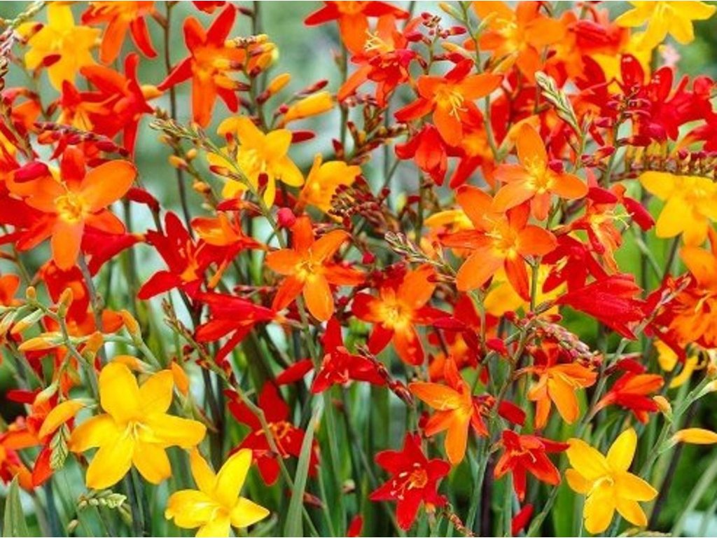 Montbrécie mix - montbrécie je svými květy velice podobná frézii, její květy však nenesou takovou barevnou škálu. Jsou často k vidění žluté, červené a oranžové odrůdy, které se v trvalkovém záhonu opravdu neztratí. V záplavě dlouhých mečovitých listů rostoucích v trsech nese bohaté květenství rostoucích na dlouhých 60 – 90 cm vysokých stoncích. Květy jsou trubkovité nebo hvězdicovité a jsou uspořádány v „kohoutím hřebínku“. Na zimu vyžaduje montbrécie chránit před mrazem přikrytím chvojím nebo vrstvou mulčovací kůry. Obecně platí, že čím větší květy rostlina nese, tím je citlivější na mráz.