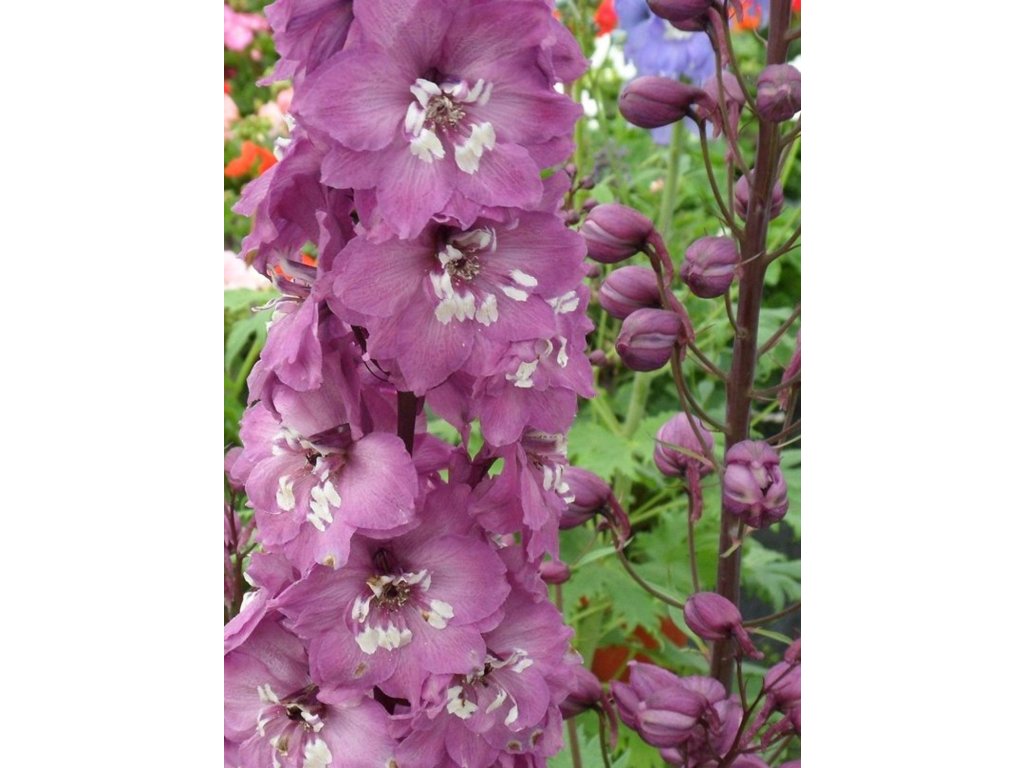 Ostrožka 'Magic Fountains Lilac White Bee' - ostrožky patří k velmi oblíbeným trvalkám. Tento kultivar dorůstá zhruba od výšky okolo 0,8 m. Listy má svěže zelené, dělené, opadavé. Rostou při zemi a mohou být až 20 cm široké. Květy mají růžové zbarvení s bílým středem, jsou poloplné, uspořádané do soukvětí a objevují se od června do srpna, tyčí se na vysokých a silných stoncích, otevírají se odspoda vzhůru. Budeme-li odkvetlé květy odstraňovat, prodloužíme tak dobu kvetení. Je vhodnou solitérní rostlinou, ale vynikne i ve skupinové výsadbě s nižšími trvalkami.