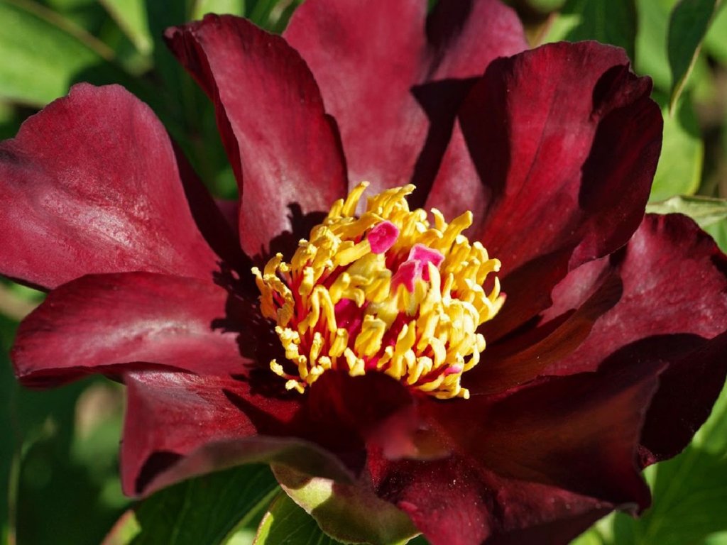 Pivoňka 'Dark Eyes' - vznikla křížením bylinných pivoněk s dřevitými pivoňkami a spojují pevné stonky, bohaté větvení a dobrou odolnost listů s každoročním zatahováním nadzemní části. První úspěšné křížení je spojované se šlechtitelem Toichi Itoh v Japonsku, později se skupina rychle rozšířila v Evropě i Severní Americe. Kultivar 'Dark Eyes' je ceněný pro hluboce červené až vínové jednoduché květy, které na tmavozeleném olistění působí velmi kontrastně. Květy o průměru přibližně 10–14 cm mají otevřený tvar se zřetelnými žlutými tyčinkami, takže dobře vyniknou i v deštivém období, kdy plné květy někdy těžknou. Kvetení bývá od května do června a díky více poupatům na rostlině může probíhat postupně po dobu dvou až tří týdnů. Lehká, někdy citrusově připomínající vůně je patrná zejména v teple. Trs dorůstá zhruba 0,8–1,0 m na výšku a podobně do šířky, stonky jsou pevné a obvykle nevyžadují oporu. Po odkvětu zůstává husté olistění, které může na podzim získat teplejší tóny a v záhonu funguje jako listová struktura. V zahradních kompozicích se uplatní jako tmavý akcent mezi žlutě kvetoucími trvalkami, u modrých kakostů, šanty a levandulí, případně ve společnosti okrasných trav. Otevřený květ poskytuje pyl pro včely a čmeláky.