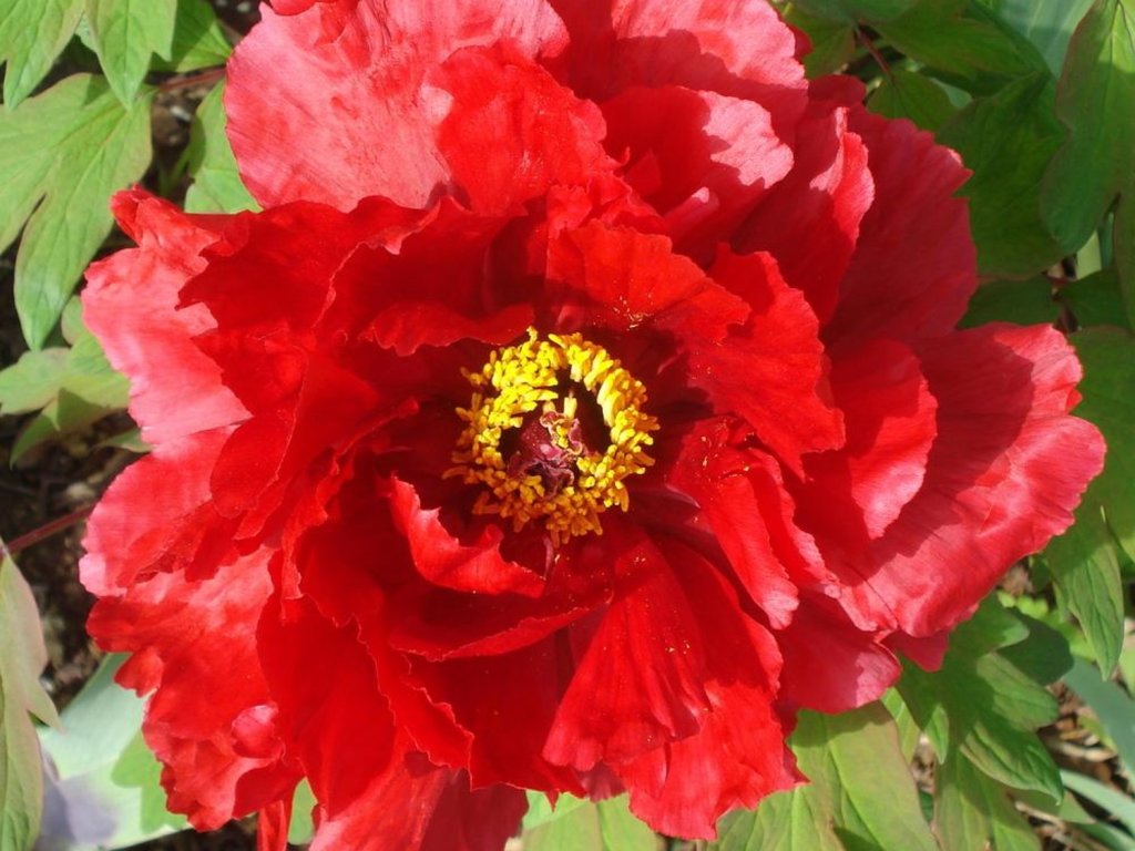 Pivoňka dřevitá 'Taiyo' - patří mezi tradiční japonské kultivary dřevitých pivoněk, v evropských katalozích uváděné již v první polovině 20. století. Jméno znamená „slunce“ a dobře vystihuje dojem z květů, které na jaře rozzáří záhon. Keř je opadavý, se stálými dřevnatými výhony, roste pomaleji a s věkem vytváří pevnou kostru, díky níž je kvetení pravidelnější. V podmínkách ČR obvykle dorůstá přibližně 1,2–1,5 m na výšku a 1,0–1,3 m na šířku. V květnu až červnu se otevírají velké poloplné květy 16–20 cm v sytě červených až šarlatových tónech, se zřetelnými žlutými tyčinkami uprostřed. Okvětní plátky bývají na okraji jemně zvlněné a květ si zachovává otevřený střed, který je dobře dostupný opylovačům a působí lehčeji než u plně plnokvětých kultivarů. Vůně bývá slabá. Květy se mohou použít i k řezu, nejlépe do mělké nádoby, kde vynikne kresba středu. Hluboce dělené listy jsou v sezoně tmavě zelené, při rašení mohou lehce bronzovět a po odkvětu vytvářejí klidné pozadí pro letní trvalky. V kompozici se osvědčuje před tmavou zelení jehličnanů, s bohyškami, dlužichami a jarními cibulovinami, případně u zídky, která zadrží teplo. Rostlina není jedlá a po požití může dráždit trávení.