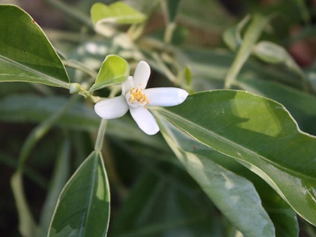 Pomerančovník hořký 'Castello Mutazione' - panašovaná odrůda pomerančovníku hořkého, známá jako okrasná i užitková forma bigarádie z italské zahrady Castello, kde byla popsána jako spontánní mutace. Základní druh Citrus × aurantium vznikl křížením pomela a mandarinky a po staletí patří ke klasickým citrusům oranžerií ve Středomoří. V podmínkách střední Evropy tvoří v nádobě středně silně rostoucí, hustý stromek, který dorůstá přibližně 1,5–2 m výšky a 1–1,5 m šířky. Větve nesou krátké trny, kůra je hnědavá a hladká. Nejvýraznějším znakem jsou podlouhle vejčité až úzce eliptické listy dlouhé až kolem 18 cm, se zeleným základem a nepravidelným žlutošedým panašováním. Řapíky jsou nápadně křídlaté, široké přibližně 1–2 cm, listy tak působí plasticky a koruna má jemnou, téměř akvarelovou kresbu. Jako stálezelený citrus zůstává dekorativní i mimo dobu plodnosti. Na jaře, zpravidla v dubnu a květnu, se v paždí listů objevují bílé, voskovité květy po jednom nebo v menších skupinách, s typicky citrusovou vůní připomínající olej neroli získávaný z hořkých pomerančovníků. Plody jsou menší až středně velké, kulovité, s hrubší, jasně oranžovou slupkou a výrazně aromatickou kůrou. Dužnina je oranžová, šťavnatá, výrazně kyselá s jemnější hořkostí připomínající grep, zatímco kůra zůstává zřetelně hořká. V nádobách v našich podmínkách dozrávají plody obvykle od listopadu do února a na rostlině mohou delší dobu vysetrvat. V kuchyni se uplatňují pro výrobu marmelád, kandované kůry, k ochucení čajů a likérů. Hořké pomeranče bývají ceněny pro obsah vitaminu C a řady rostlinných látek využívaných v potravinářství a tradičním bylinářství.