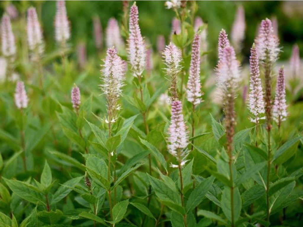 Rozrazil viržinský 'Pink Glow' - rostlina pochází ze světlých luk, prérií a okrajů lesů východní části Severní Ameriky a je oblíbenou trvalkou v evropských zahradách pro svou výraznou výšku a eleganci. Tento kultivar vznikl selekcí světle růžové formy druhu a odlišuje se kompaktnějším, přesto vzpřímeným vzrůstem a pevnými výhony, které od jara budují mohutné trsy. V dospělosti dosahuje běžně výšky 120-150 cm a šířky 50-60 cm, se stonky tvořícími výrazné vertikální linie v záhonu. Listy má kopinaté, tmavě zelené, v přeslenech po 3-6 čepelích podél stonku, což dodává rostlině strukturovanou vizuální dynamiku i mimo období kvetení. Květy jsou drobné, světle růžové až téměř bílé, uspořádané v dlouhých, štíhlých klasovitých květenstvích, která se otevírají postupně od báze směrem nahoru, přičemž hlavní vlna kvetení nastává od července do září, čímž prodlužuje sezonu barev v záhonu. Po odkvětu mohou zůstat plodenství dekorativní až do zimy a přitahují opylovače jako včely, čmeláky či motýly. ‘Pink Glow’ vnáší do zahradní kompozice jemnou pastelovou barvu a dobře kontrastuje s tmavším listem ostatních druhů i s ostře tvarovanými travinami nebo výraznými letničkami.