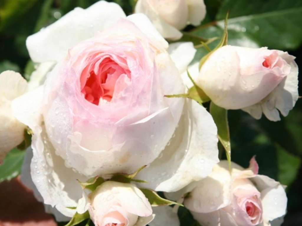 Růže 'Stephanie Baronin zu Guttenberg®' - velmi romanticky vypadající růže, dorůstající do výšky okolo 50 - 80 cm. Je velmi dobře odolná vůči typickým chorobám růží a stejně tak i mrazu. Listy má lesklé a tmavě zelené, výrazně tedy kontrastují s květy. Ty mají bledě růžový nádech, v průměru jsou 6 - 8 cm velké. Růže nakvétá po celé léto.