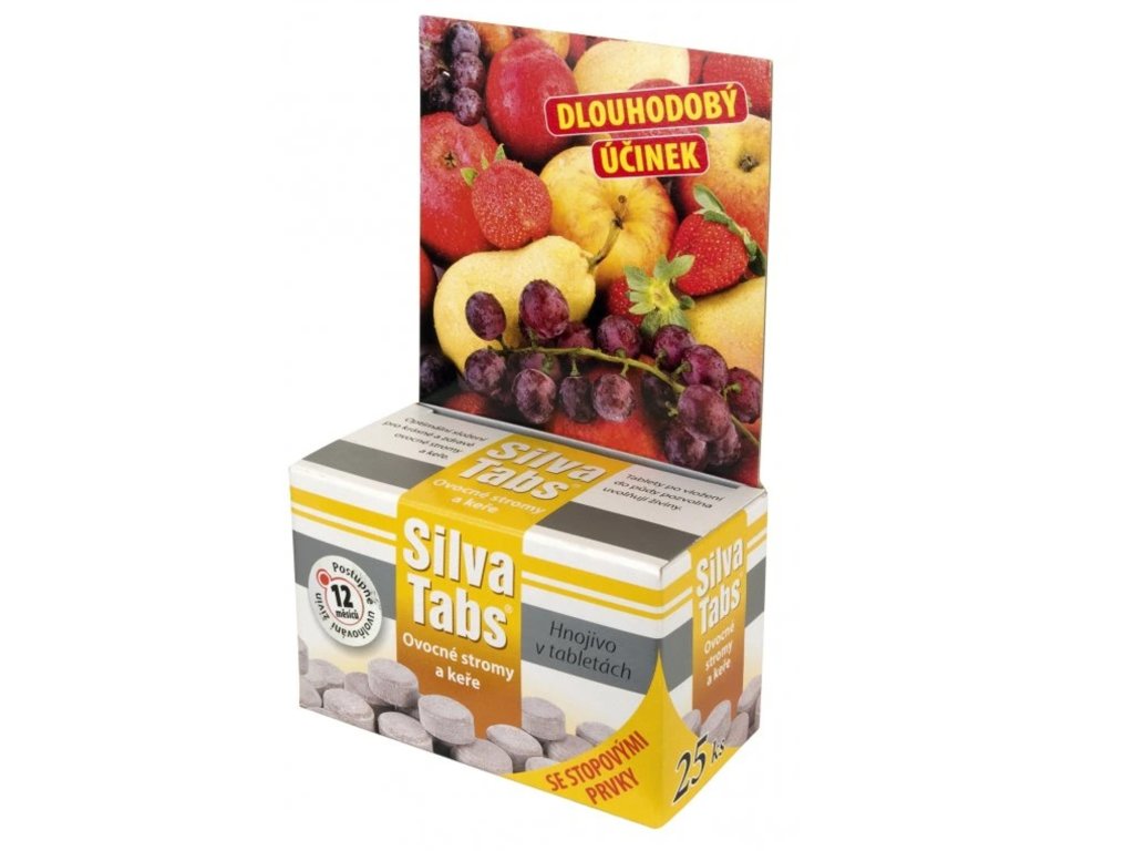Složení - Silva Tabs na ovocné stromy a keře jsou tabletové NPK hnojivo s přibližným obsahem 17 % dusíku (N), 17 % fosforečného aniontu (P₂O₅) a 5 % oxidu draselného (K₂O) doplněné o 11 % oxidu hořečnatého (MgO) a běžné stopové prvky jako bor, měď, železo, mangan, molybden a zinek, které přispívají k vyvážené výživě rostlin po dlouhou dobu a podporují zdravý vývoj i plodnost.