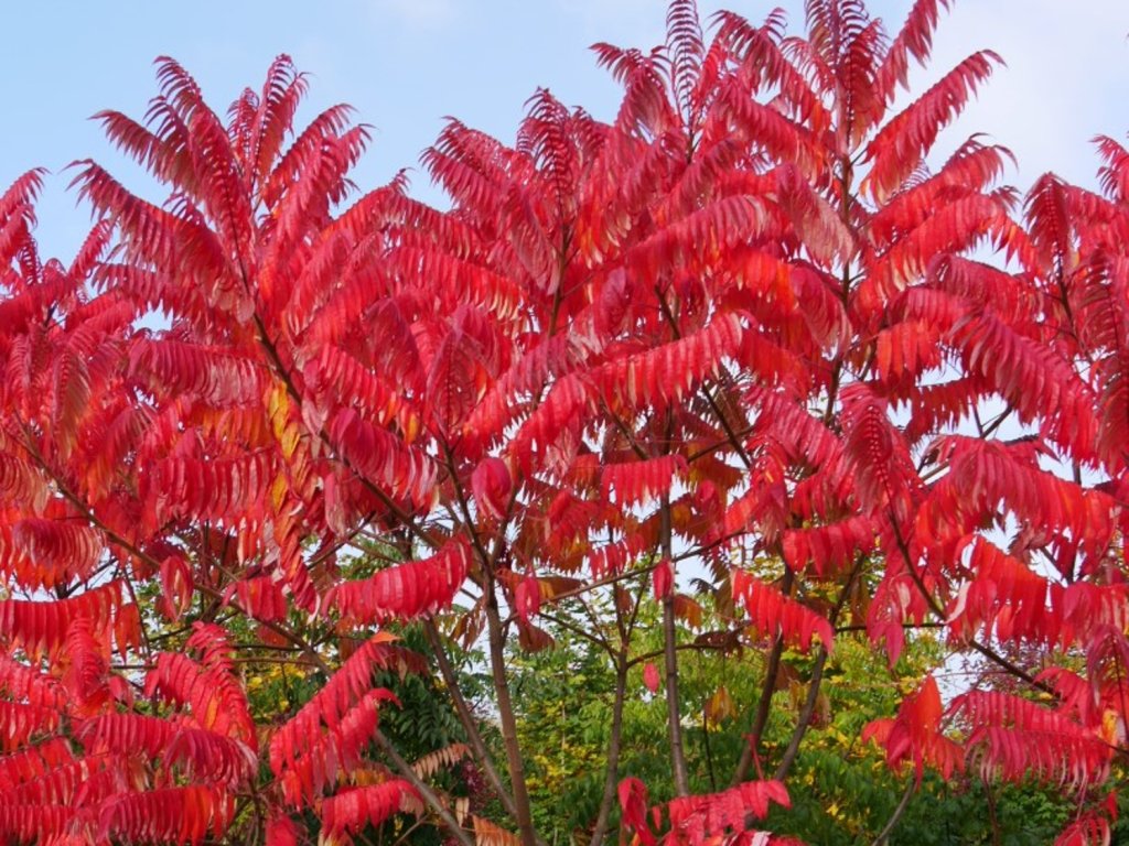 Škumpa orobincová - pochází z východní části Severní Ameriky, kde roste na okrajích lesů, na suchých svazích i v narušených stanovištích s kamenitou půdou. Vytváří opadavý keř až menší strom s několika kmeny, obvykle 3–6 m vysoký a 4–6 m široký, s typicky sametově chlupatými letorosty připomínajícími paroží. Listy jsou velké, lichozpeřené, často 35–50 cm dlouhé, s 9–31 pilovitými lístky. Od léta do podzimu se vybarvují do oranžové až karmínové a zahrada získává výraznou sezónní kresbu. Druh je dvoudomý, v červnu až červenci se na koncích výhonů objevují husté kuželovité laty drobných zelenožlutých květů, většinou bez výrazné vůně. Květy poskytují pyl a nektar hmyzu, přestože jsou na pohled nenápadné. Na samičích rostlinách po odkvětu dozrávají vzpřímené červené plodenství z drobných chlupatých peckovic, která často vytrvávají do zimy a jsou cenným zdrojem potravy pro ptactvo. V tradiční severoamerické kuchyni se kyselé oplodí používá k přípravě nálevu známého jako sumac lemonade, v zahradě je však hlavním přínosem rychlé clonění, stabilizace svahů a přirozeně působící skupiny v krajinářských výsadbách. Je třeba počítat s kořenovými výmladky, které mohou vytvářet rozsáhlejší kolonie. Mléčná šťáva může u citlivé pokožky vyvolat podráždění, proto se při řezu hodí rukavice.