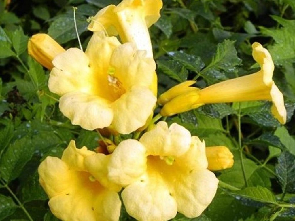 Trubač kořenující 'Yellow Trumpet' - kultivar trubače s výraznými, trubkovitými žlutými květy, které přitahují opylovače, zejména včely a motýly. Tento kultivar dorůstá výšky 6 až 10 metrů a je ideální pro pokrytí pergol, zídek či plotů, kde vytváří bujný a dekorativní porost. Kvete od července do září, přičemž jasně žluté květy vytvářejí krásný kontrast se sytě zelenými, lesklými listy. Ty na podzim opadávají. Trubač je mrazuvzdorný a v našich podmínkách přezimuje bez problémů. Tento kultivar je energický a nenáročný na údržbu, ale je dobré ho pravidelně zastřihávat, aby udržel kompaktní tvar a podporoval kvetení.