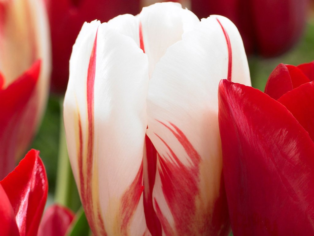 Tulipán 'Carnaval de Rio'- barevnost okvětních plátků tohoto kultivaru je unikátní. Sněhově bílé plátky jsou uprostřed probarveny nádherným červeným žíháním. Květy jsou jednoduché, objevují se v průběhu dubna a května. Rostlina dorůstá do výšky okolo 80 cm, pro řez je tedy ideální. Vynikne i samostatně, díky pestrosti květů.