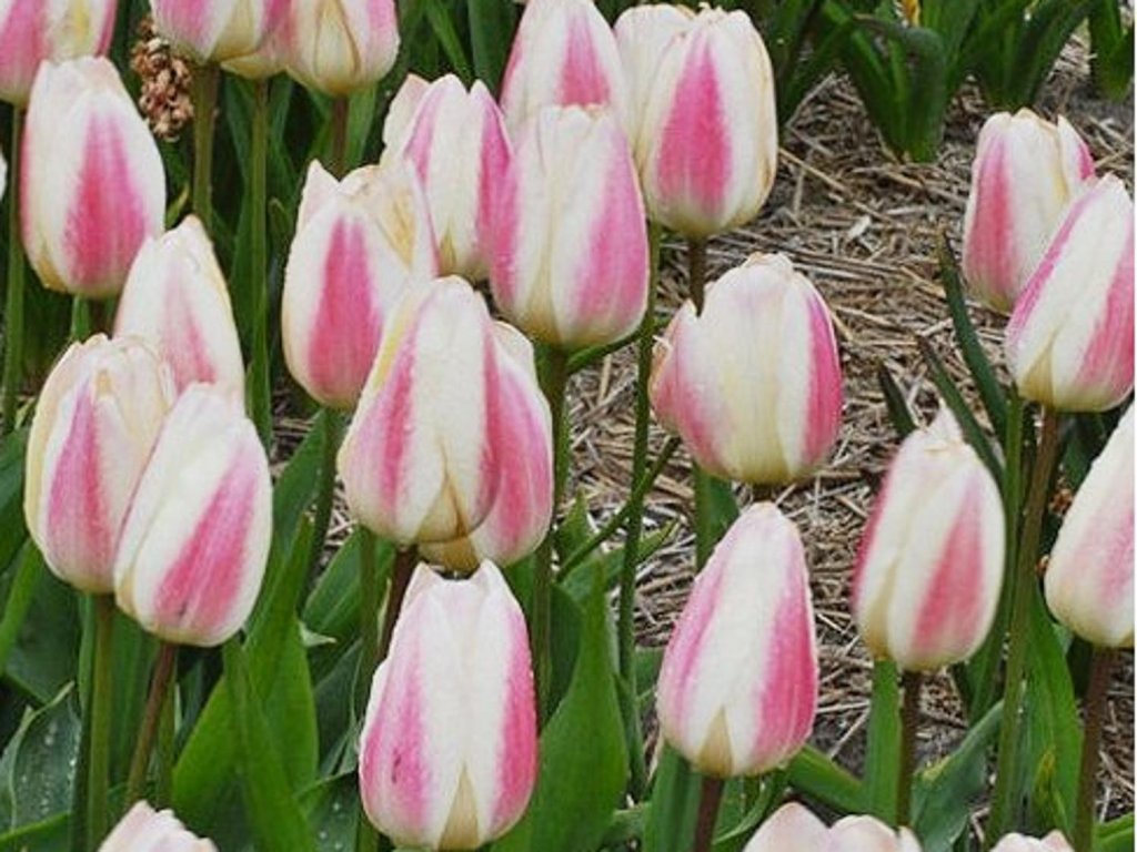 Tulipán 'Silk Surprise'- máte-li zahradu v pastelových odstínech nebo jste-li fanoušek romanticky laděných zahrad, pak je tento tulipán jasnou volbou. Základní barva okvětních plátků je krémově bílá, každý plátek je probarven světle růžovou barvou. Tyto dvě barvy se jemně prolínají. Dorůstá do výšky 40 cm a kvete v průběhu dubna. Stonky jsou silné, je tedy ideální k řezu.