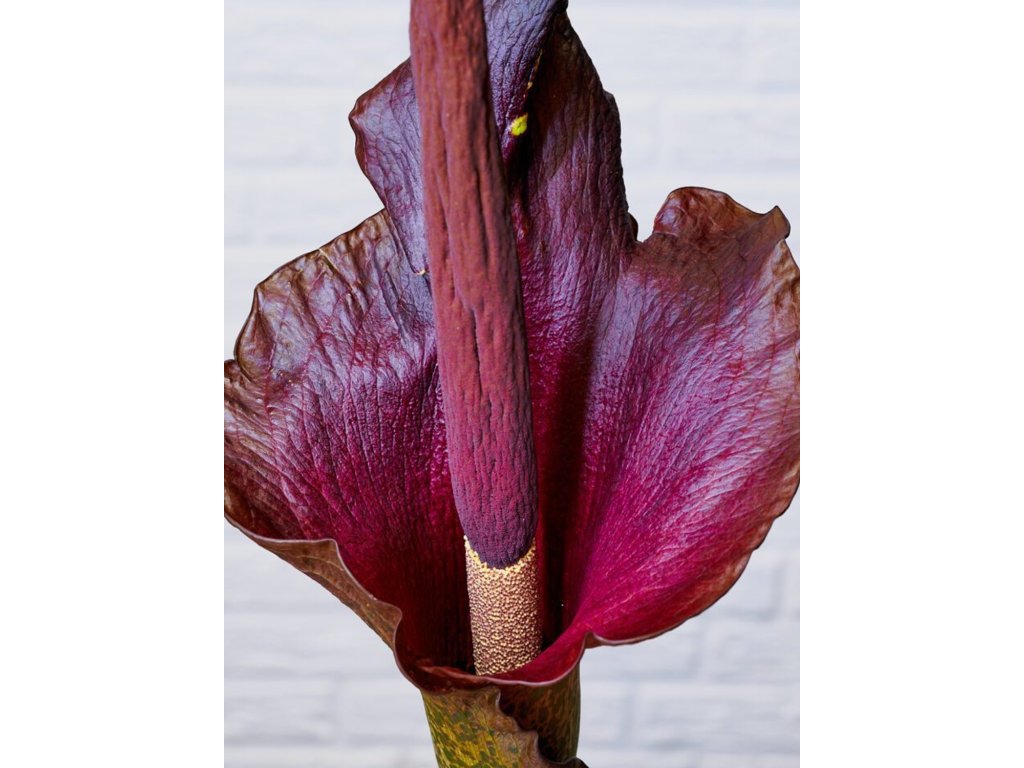 Zmijovec indický - pochází z východní a jihovýchodní Asie, kde roste v podrostu světlých lesů a na humózních, letně vlhkých svazích. Je to hlíznatá trvalka s výrazným sezónním rytmem a proměnlivou podobou. Na začátku léta se z vyzrálé hlízy může objevit jediný květ: tmavě purpurový toulcovitý listen s lesklým povrchem a štíhlý, hnědavý až purpurový palicový klas. Květenství bývá vysoké desítky centimetrů a uvolňuje typickou vůni, která v přírodě přitahuje mouchy. Po odkvětu vyrůstá jeden mohutný list, 2–3krát zpeřený, s množstvím drobných lístků a rozpětím až okolo 1,3–1,5 m. List je nesen pevnou, olivově zelenou stopkou s bělavým mramorováním, která působí téměř jako kmenek. V dospělosti vytváří rostlina trs přibližně 1–1,5 m vysoký i široký a během sezóny často zakládá dceřiné hlízy, takže je možné ji postupně množit. Celá rostlina obsahuje krystaly šťavelanu vápenatého, proto je při manipulaci vhodné používat rukavice a zabránit kontaktu šťávy s očima a sliznicemi. Podzemní hlíza se v Asii tradičně zpracovává na konjakovou mouku a želírovací produkty. Obsahuje významný podíl glukomannanu, rozpustné vlákniny využívané v potravinářství.